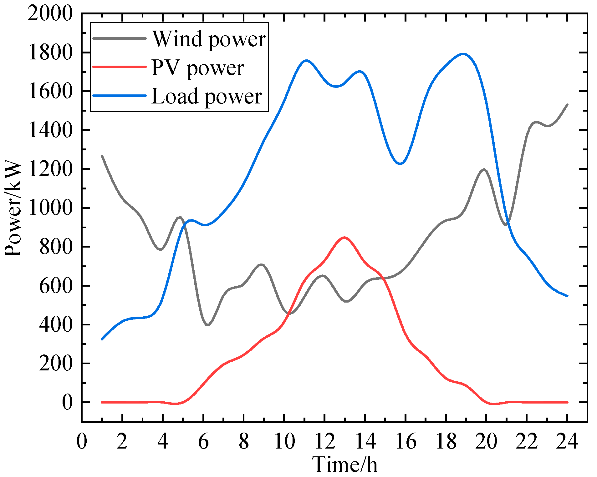 Figure 2 below. The relevant parameter settings are as follows: Distributed photovoltaic (PV) and wind power are connected at Node 3 and Node 15, with rated capacities of 150 kW and 200 kW, respectively. An energy storage device is installed at Node 22, featuring a charge/discharge efficiency of 0.92, a capacity of 300 kWh, and a maximum charge/discharge power of 100 kW. The unit capacity configuration cost for the VDAPF is 40