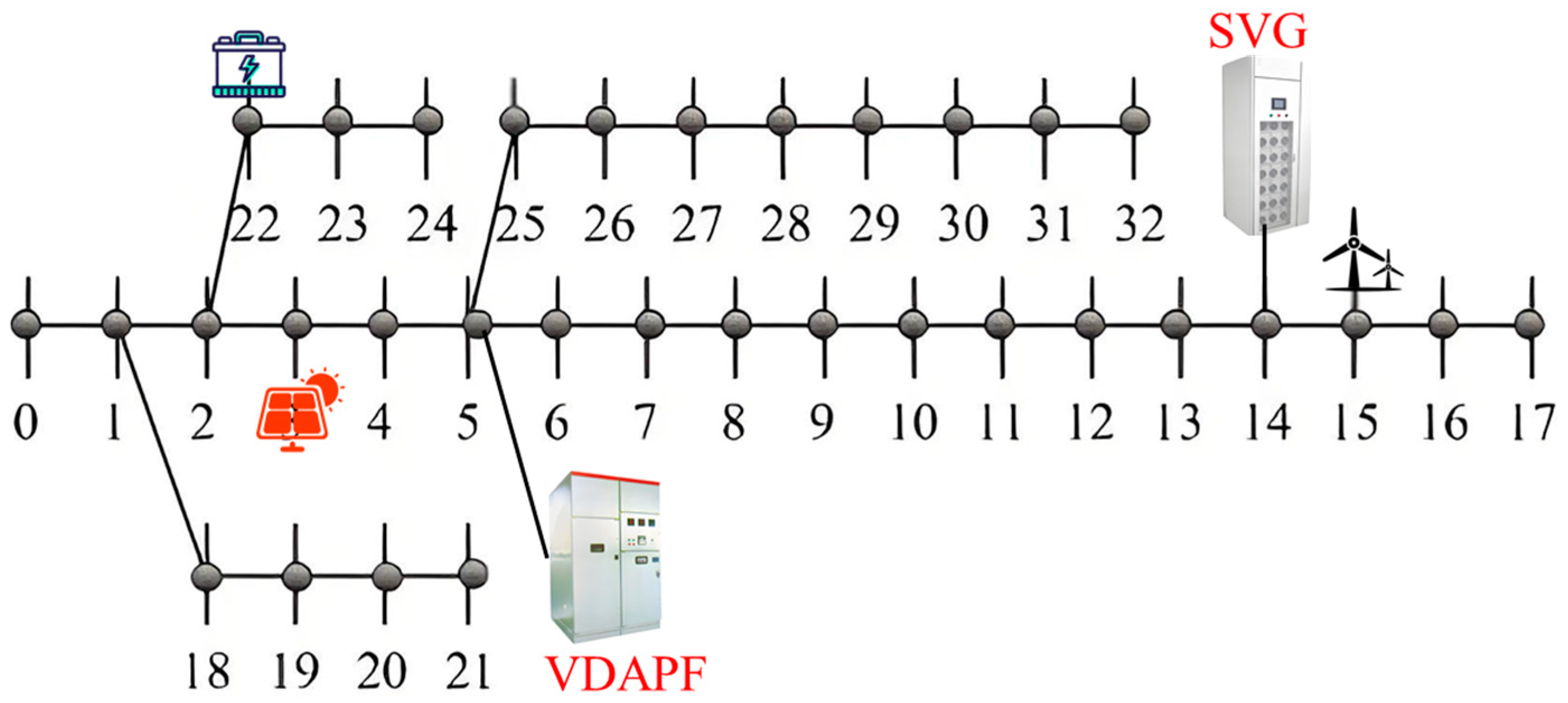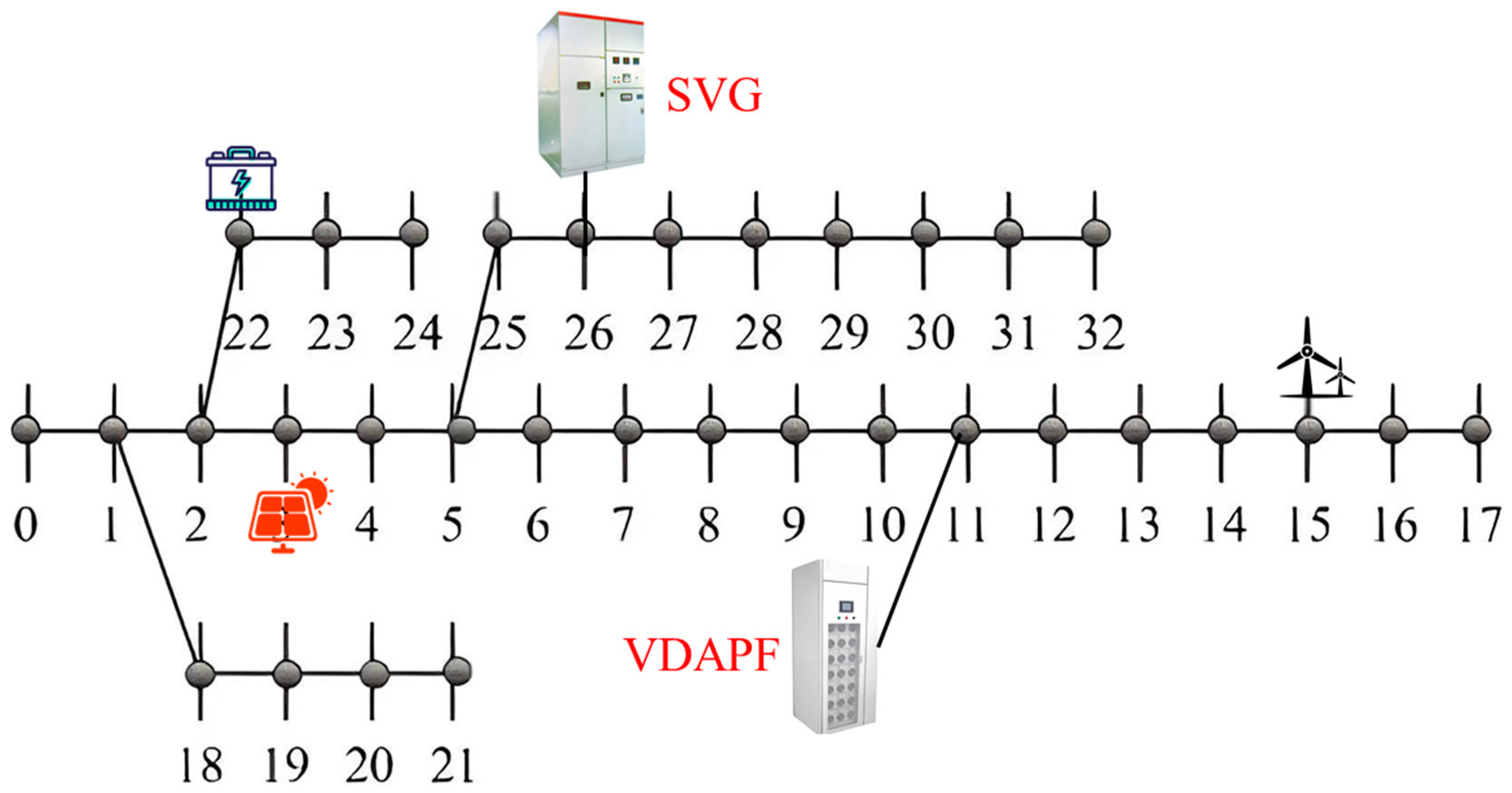 To further demonstrate the effectiveness of the algorithm proposed in this paper, an improved IEEE-33-node test system is employed for case verification. As a classic benchmark model in distribution network research, this system features a clear structure, transparent parameters, and a reasonable load distribution, enabling it to effectively simulate the radial topology and diverse load characteristics of actual distribution networks. With a moderate scale of 33 nodes, it can clearly demonstrate the synergistic effects of zonal optimized equipment allocation on harmonic suppression and voltage control, providing a reliable basic validation platform for subsequent expansion to larger-scale systems. The topological structure of the test system is illustrated in