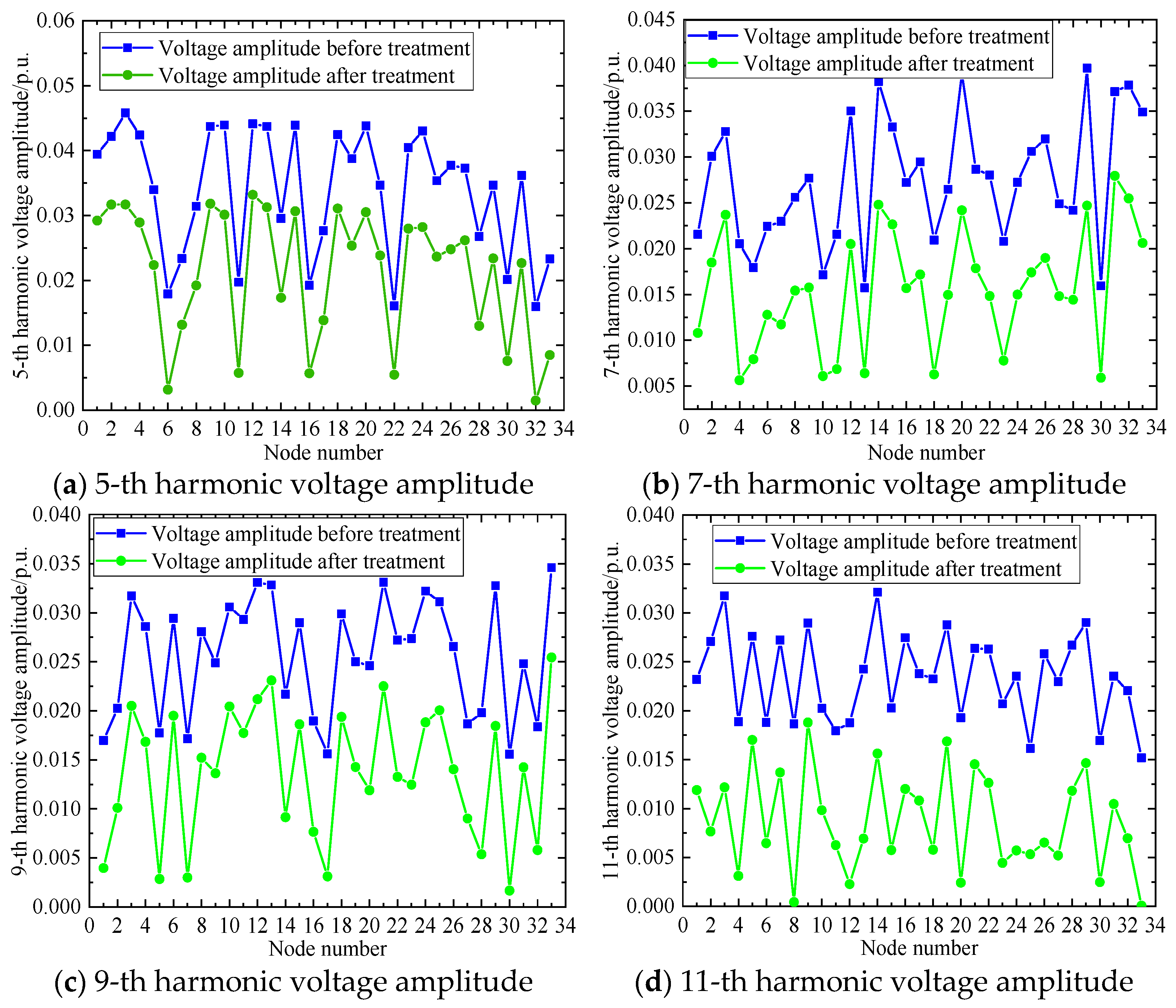 To facilitate a comparison of the differences in harmonic voltages before and after distribution network mitigation, this paper employs per-unit values to represent harmonic voltages. A comparison of the harmonic voltage curves for the 5th, 7th, 11th, and 13th harmonics before and after distribution network mitigation is shown in