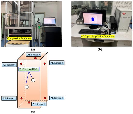 Schematic diagram of (a) compression equipment, (b) AE signal acquisition equipment, (c) AE probe layout.