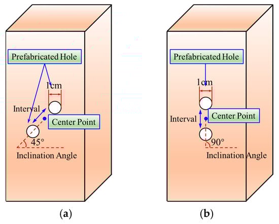 Schematic diagram of specimen containing prefabricated holes, (a) 45° inclination angle and (b) 90° inclination angle.