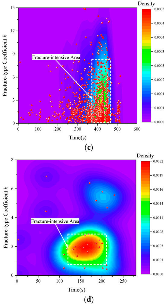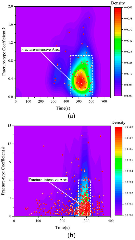 For specimen DH3, the tensile and shear fractures both exhibited abundance and spatial concentration. The fractures predominantly clustered within the 450–480 s interval, revealing temporally correlated fracture behaviors where tensile cracks significantly outnumbered shear cracks. The fracture-type coefficient demonstrated pronounced concentration near the tensile–shear transition threshold (k = 1), with corresponding fracture density reaching 3.150 × 10−5. During this fracture concentration period, tensile fracture density substantially exceeded that of shear fractures in specimen DH3. When the bridge angle was 90°, its fractures occurrence remained relatively low as the specimen predominantly experienced tensile failure. Within the high-density fracture cluster, the fracture-type coefficient k exhibited density values spanning 3.250 × 10−4 to 6.250 × 10−4. This density range and corresponding time interval confirmed significantly greater tensile fracture development.