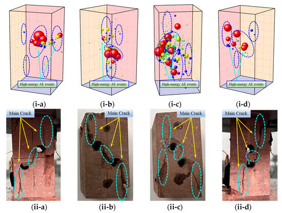 High-energy AE events in specimen DH3 predominantly clustered along two discrete fracture propagation pathways. The primary fracture path extended from the upper-right quadrant to the mid-left region, followed by a secondary pathway propagating toward the lower-right section. Scattered secondary AE events occurred throughout the central specimen region. Figure 5(ii-c) revealed an inclined macroscopic crack near the left prefabricated circular hole, and another dominant crack aligned with the prefabricated holes’ orientation. Specimen DH4 exhibited high-energy AE events primarily concentrated along a diagonal trajectory from the upper-left to lower-right regions, with peak density persisting in the central zone. Figure 5(ii-d) revealed a macroscopic surface crack initiating in the upper-right specimen region that propagated axially downward toward a circular hole in the lower section. Subsequently, the fracture extended axially toward the lower-left quadrant.