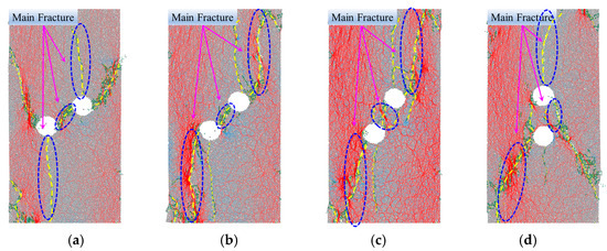 As illustrated in Figure 6c, the compressive and tensile force chains of specimen DH3 exhibited complementary distributions, with tensile chains predominantly localizing at crack tips and stress-concentration zones. These tensile chains facilitated crack propagation through the specimen. The tensile cracks concentrated peripherally around holes, extending preferentially orthogonal to the interhole connection axis, and its shear cracks clustered dominantly on lateral hole peripheries and specimen boundaries. Primary fractures propagated progressively along the hole-connection trajectory, forming a continuous failure surface through radial extension from hole edges.