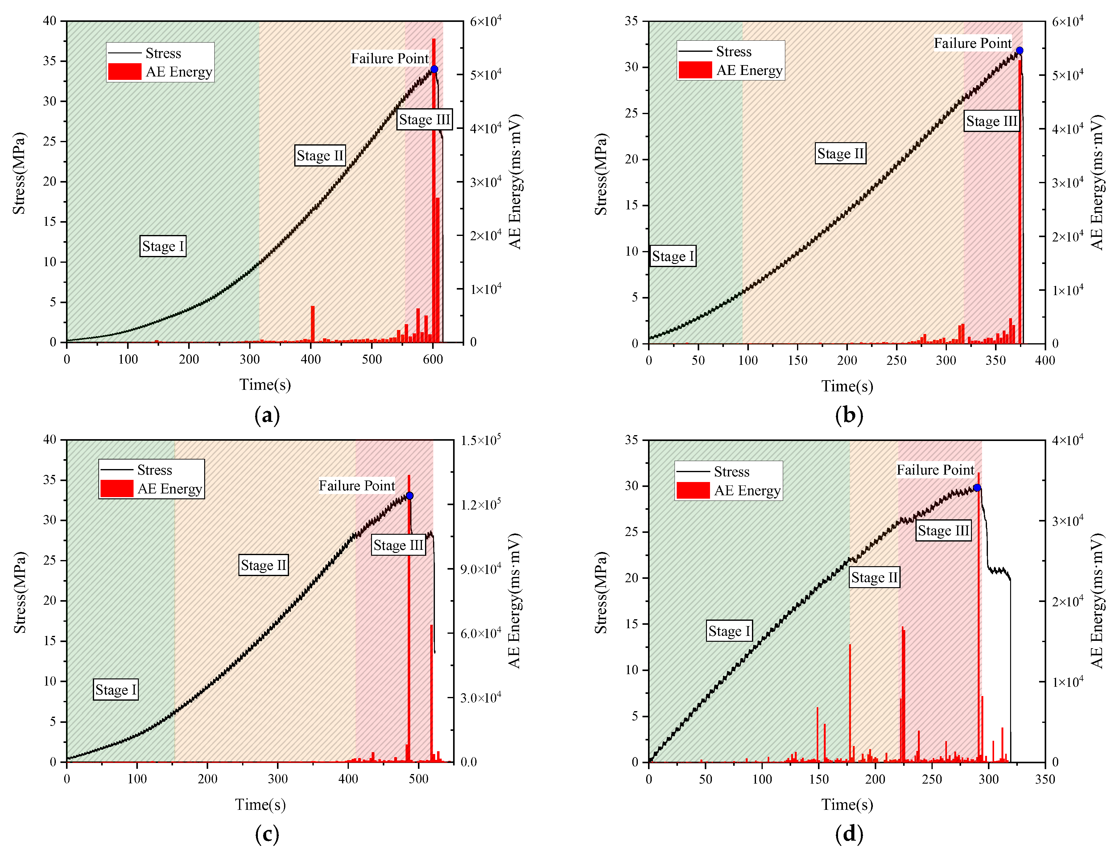 In the period immediately preceding the critical failure–instability point, AE energy levels remained relatively stable with minimal fluctuations. Their values were consistently low during this comparatively quiescent phase, showing no discernible precursor phenomena to the impending instability. At the critical failure–instability point itself, AE energy exhibited a marked leap, and this surge represented a significant increase compared to the values recorded during the preceding deformation stages.