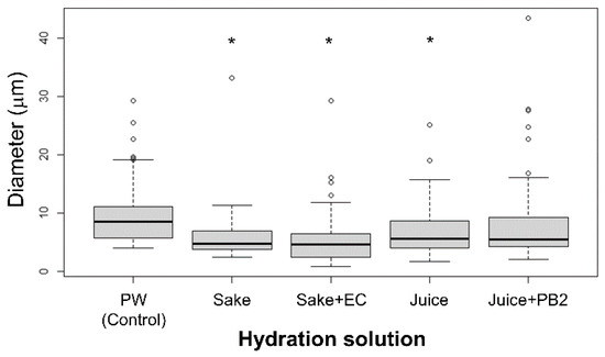 Liposome diameter as a function of the hydration solution. All liposomes were composed solely of DOPC, and diameters were measured for 60 liposomes under each condition. The actual concentrations of EC and PB2 used in the experiments were as follows: Pure water (PW, control; EC: 0 mg/L, PB2: 0 mg/L), Sake (EC: 7.2 mg/L), Sake + EC (EC: 93.6 mg/L), Juice (PB2: 1 mg/L), and Juice + PB2 (PB2: 2 mg/L). Asterisks (*) indicate a statistically significant difference from the PW (control (p < 0.05)). Small circles represent outliers. Whiskers denote the minimum and maximum data points, excluding outliers. The lower and upper quartiles are represented by the edges of the box, while the median diameter for each condition is indicated by a horizontal bar within the box.