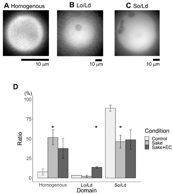 Observable domain types were considered to reflect the following energy balance. When homogeneity is present, mixing is favorable due to the low mixing energy required. In a homogeneous situation, relatively small fluidic differences within each domain or region seemed possible. In the case of So/Ld phase separation, the mixing energy is high because the fluidic difference between the two regions is significant. In control cell-sized liposomes, mainly So/Ld phase separation was observed with DOPC/DPPC/Chol 45/45/10 (Figure 2D). In the presence of sake or sake with added EC, the So domain was observed, suggesting that So domains may be formed by DPPC, Chol, and EC. As EC concentration increases, domain fluidity in-creases because EC has a short carbon chain, causing some domains to change from So to Lo (Figure 2D). EC may also integrate into the Ld domain, decreasing the fluidity difference between So and Ld or Lo and Ld. In such a situation, in-creased homogeneity is advantageous due to the lower mixing energy required.