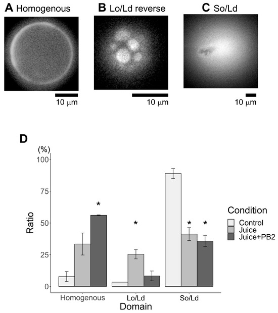 Major phase separation of control liposomes via solid ordered (So)/liquid disordered (Ld) phase separation using apple juice. (A) Homogenous, (B) Lo/Ld reverse, (C) So/Ld, and percentages of phase-separated liposomes are calculated using the total number of observed liposomes ((D), (* p < 0.05)). Asterisks (*) indicate statistically significant differences compared with the respective control (p < 0.05). All liposomes were made from DOPC:DPPC:Chol (45:45:10) hydrated using apple juice. All experiments were performed at 20 °C.
