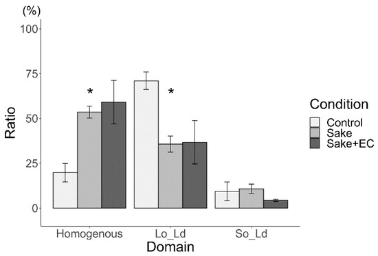 Major phase separation of control liposomes via liquid ordered (Lo)/liquid disordered (Ld) phase separation with sake (* p < 0.05). Asterisks (*) indicate statistically significant differences compared with the respective control (p < 0.05). All liposomes were made from DOPC:DPPC:Chol (40:40:20) in hydrated using sake.