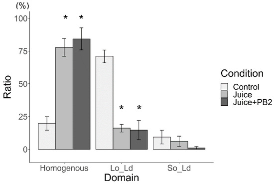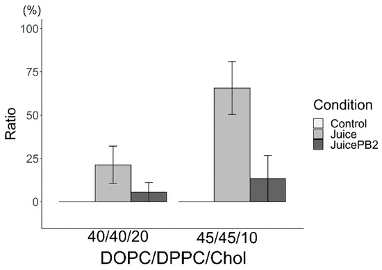 Major phase separation of control liposomes via liquid ordered (Lo)/liquid disordered (Ld) phase separation with apple juice (* p < 0.05). Asterisks (*) indicate statistically significant differences compared with the respective control (p < 0.05). All liposomes were made from DOPC:DPPC:Chol (40:40:20) hydrated using apple juice.