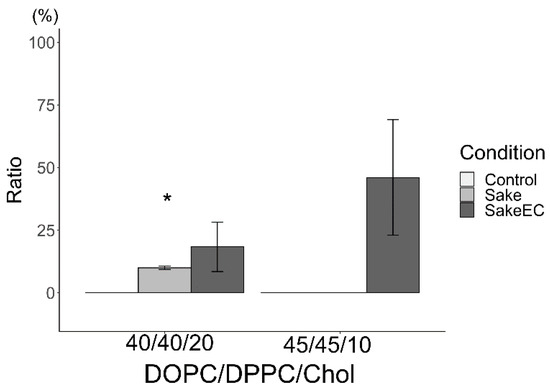 Ratio of reverse domain for liposomes hydrated using sake (* p < 0.05). Asterisks (*) indicate statistically significant differences compared with the respective control (p < 0.05). Liposomes were made from DOPC:DPPC:Chol (40:40:20 and 45:45:10).