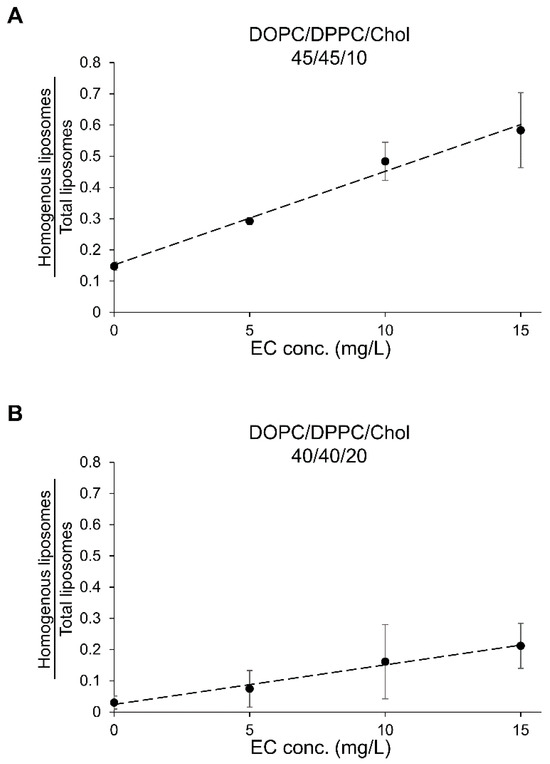 Calibration curves for ethyl caproate (EC) using the liposome observation method. The calibration equations were determined as follows: For DOPC/DPPC/Chol (45/45/10): [EC] = ([Homogenous liposomes/total liposomes] − 0.15)/0.030, R2 = 0.99, For DOPC/DPPC/Chol (40/40/20): [EC] = ([Homogenous liposomes/total liposomes] − 0.025)/0.013, R2 = 0.98. Panels (A,B) depict the calibration curves for EC in DOPC/DPPC/Chol (45/45/10) and DOPC/DPPC/Chol (40/40/20), respectively.