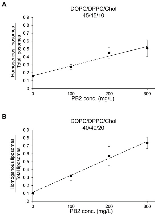 Calibration curves for procyanidin B2 (PB2) using the liposome observation method. The calibration equations were determined as follows: For DOPC/DPPC/Chol (45/45/10): [PB2] = ([Homogenous liposomes/total liposomes] − 0.16)/0.0012, R2 = 0.97, For DOPC/DPPC/Chol (40/40/20): [PB2] = ([Homogenous liposomes/total liposomes] − 0.11)/0.021, R2 = 0.99. Panels (A,B) depict the calibration curves for PB2 in DOPC/DPPC/Chol (45/45/10) and DOPC/DPPC/Chol (40/40/20), respectively.