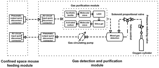 Figure 2 illustrates the three main components of the system: the oxygen supply unit, the mixture chamber, and the hazardous gas purification unit. The gas circuits and structural design are interconnected. For instance, to provide a consistent and adjustable oxygen supply, the oxygen supply unit includes an oxygen cylinder, cylinder-mounting clamps, a shut-off valve, a pressure reducer, a safety valve, a proportional valve, and connecting conduits, among other parts. The hazardous gas purification system includes HEPA filters to eliminate particles and specialized purification reagents designed to target common metabolic waste gases like carbon dioxide, ammonia, and hydrogen sulfide. The order of adsorbent in the purification unit was not randomly arranged, and we designed it to use the by-products of adsorption process in the previous stage. Firstly, the process gas flowed through the bed of synthetic zeolite and 5A molecular sieve. The main role of this bed was pre-dehumidification and to take out part of polar gases such as ammonia to obtain a relatively dry gas stream in the next stage. After that, the gas flowed through LiOH bed to remove CO2. However, we should note that LiOH would generate water vapor according to Equation (3) in the manuscript, and this would be included in the gas stream. Therefore, to avoid the influence caused by the moisture in the gas stream, we placed another stage of the cleaning system, which was composed of color-changing silica gel and another 5A molecular sieve, after the LiOH bed to remove the moisture generated in the reaction. At last, the gas passed through the activated carbon bed to adsorb VOCs or odors on the carbon, and obtained high quality air to return to the animal habitat. We arranged the CO2 scrubber between the upstream adsorbents and downstream adsorbents to pre-dry the incoming gas and post-dry the effluent gas. This system provides long-term control and safety for the experimental environment by effectively removing animal odors and dangerous metabolic gases. Gas mixing and environmental parameter monitoring are conducted using a gas pump and sensor module within the mixing chamber.