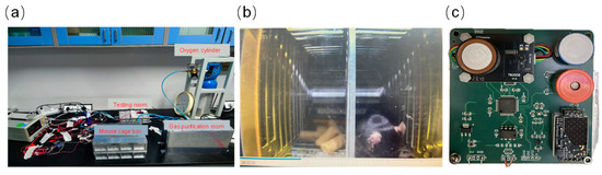 The test diagram for ground simulation: (a) Connections between components of the experimental environment, (b) mouse status during the experiment, and (c) circuit board for gas detection sensor.