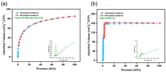 Adsorption isotherms were recorded at 25 °C (room temperature) by static volumetric method from BSD-660MC A3MC gas adsorption analyzer (Beishide Instrument Technology Co., Ltd., Beijing, China). Before the measurement, all samples were degassed under vacuum at 120 °C for 12 h to remove the adsorbed moisture and impurities. The isotherms were recorded in the range of 0–1 bar. The specific surface areas of zeolite 13X and LiOH were determined by nitrogen adsorption at 77 K and calculated by the BET method. The pore size distribution was obtained from the adsorption branch of the N2 isotherm by the NLDFT model.