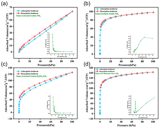 The adsorption isotherms and pore size distribution of adsorbents for NH3 gas adsorption and desorption (Testing temperature: 25 °C): (a) Traditionally used activated carbon, (b) synthetic zeolite, (c) activated carbon modified with phosphoric acid, and (d) 13X molecular sieve.