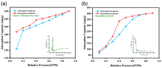 Adsorption isotherms and pore size distribution of adsorbents for H2O gas adsorption and desorption (Testing temperature: 25 °C): (a) 5A molecular sieve and (b) color-changing silica gel.