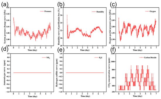 Environmental conditions of the 7-day sealed culture system. (a) The pressure of system in real time, which the system maintained in the range 101–103 kPa. (b) The change in relative humidity, which was kept within 30–36%. (c) The oxygen concentration, which the system kept within 19–21%. (d) The carbon dioxide concentration, which the system kept below 1000 ppm. (e) The ammonia concentration, not detected. (f) The hydrogen sulfide concentration, below detection limit.