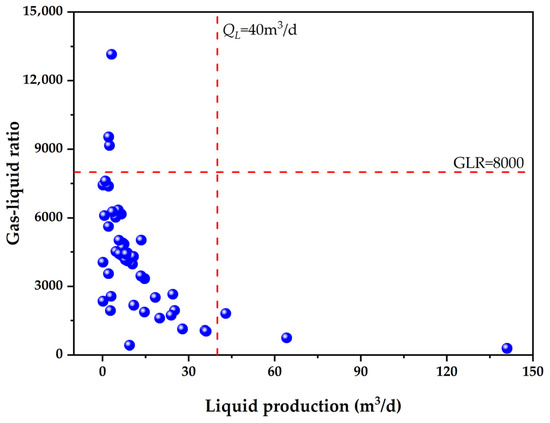 Statistical data indicate that the gas–liquid ratio (GLR) of horizontal wells in the target block ranges from 0 to 13,000, with liquid production (QL) varying between 0 and 140 m3/d. It is noteworthy that the majority of wells exhibit GLR values within the range of 0 to 8000 and QL between 0 and 40 m3/d. The analysis of liquid production levels indicates that 32.65% of horizontal wells exhibit a production capacity ranging from 0 to 5 m3/d, 44.90% demonstrate a capacity between 5 and 15 m3/d, 16.33% display a capacity between 15 and 40 m3/d, and 6.12% exceed 40 m3/d (Figure 1).