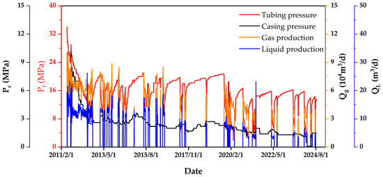 During the development process, a continuous decline in formation pressure combined with increasing water production has led to increasingly severe liquid loading issues in horizontal gas wells. The production dynamic characteristics of the typical horizontal gas wells in the study area are demonstrated in Figure 2. In the initial phase of production, the tubing pressure (Pt) and casing pressure (Pc) exhibited elevated levels, while the gas (Qg) and liquid production rates of the gas well demonstrated stability, enabling sustained output at a high rate. As the process of liquid loading takes place, there is a gradual decline in various production indicators on an annual basis. In the context of the intermittent production system, there is a gradual reduction in the well opening period, accompanied by a substantial decline in the pressure recovery value following well shutdown. This phenomenon poses a significant challenge to the stability of production. In order to ensure stable gas well production, it is essential to implement an integrated water management strategy based on the principle of ‘classification-based treatment and combined control and drainage’. Consequently, a refined classification of gas wells according to varying drainage and production requirements is of critical importance.