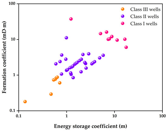 Figure 3 presents the distribution characteristics of the energy storage coefficient and formation factor across 48 horizontal gas wells in the study area. Based on the parameter values of R and Kh, these wells, which exhibit distinct static performance (SP), can be effectively classified into three categories. The classification results indicate that Class I, characterized by the highest quality, encompasses 10 wells (20.8%); Class II, with medium quality, comprises 31 wells (64.6%); and Class III, characterized by the lowest quality, includes 7 wells (14.6%).