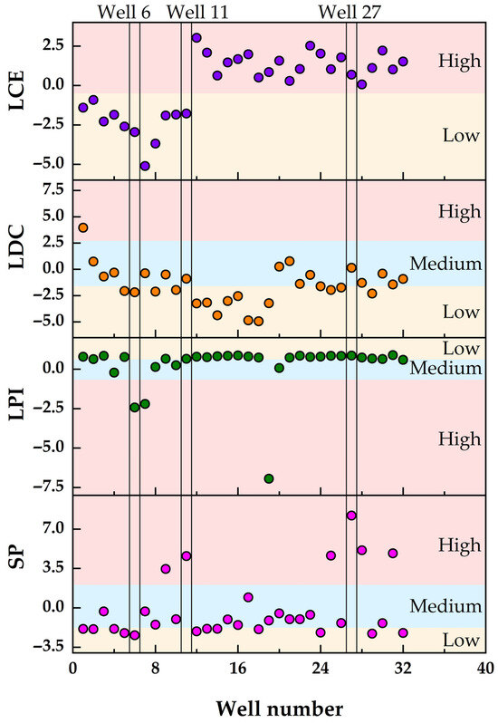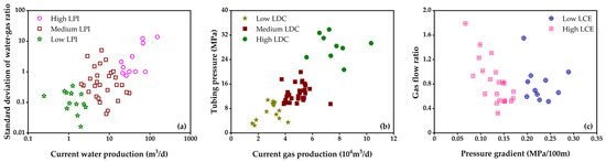 As suggested by Zhu et al. [8], LPI is quantified using two parameters: current water production (Qw) and the standard deviation of the water-to-gas ratio (Sdrwg). Qw serves as a direct indicator of drainage demand. Wells with high water production exhibit a greater liquid phase load and require enhanced drainage intensity to maintain liquid-carrying production, resulting in higher liquid production intensity. Conversely, wells with low water production have a lower liquid phase load and can sustain liquid-carrying production through natural energy or minimal auxiliary support, leading to lower liquid production intensity.