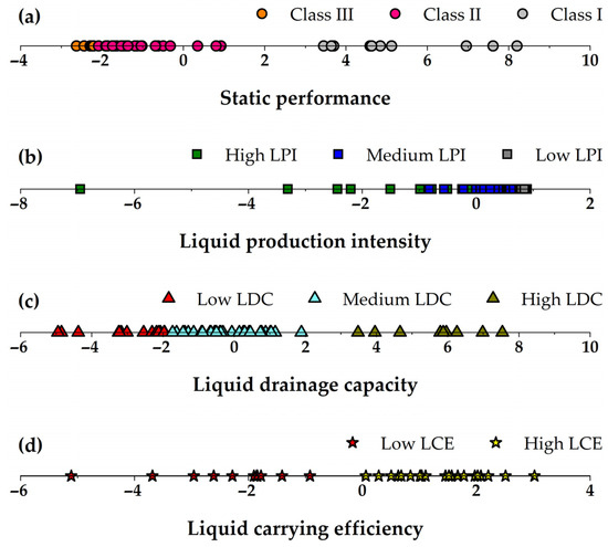 To assess the consistency between static and dynamic classification outcomes, Linear Discriminant Analysis was employed to perform dimensionality reduction on the performance indicators of horizontal gas wells. LDA is a well-established supervised learning technique that integrates dimensionality reduction with classification [22]. Its fundamental principle involves projecting the original dataset into a lower-dimensional space by maximizing the ratio of between-class scatter to within-class scatter. This approach identifies the optimal projection direction through the solution of a generalized eigenvalue problem, thereby ensuring compact intra-class clustering and effective inter-class separation, which ultimately enhances classification accuracy. Following LDA-based dimensionality reduction, four representative low-dimensional features were extracted, corresponding to static performance, liquid production intensity, liquid drainage capacity, and liquid carrying efficiency. Their spatial distribution within the projected subspace is illustrated in Figure 5. As shown, with the exception of liquid production intensity, the various categories exhibit greater separation along the LDA axis.
