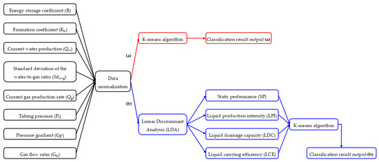 Classification schemes for horizontal gas wells based on the integration of dynamic and static parameters: (a) direct clustering method (scheme 1), (b) LDA-Kmeans fusion clustering method (scheme 2).