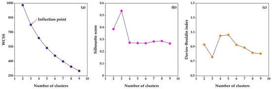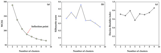 The variation trend of evaluation indicators in scheme 2 with respect to changes in the number of clusters: (a) WCSS, (b) silhouette score, and (c) Davies–Bouldin index.