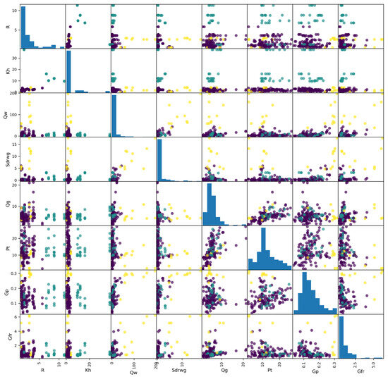When constructing a model based on the direct clustering scheme illustrated in Figure 7a, it is essential to first determine the optimal number of clusters, denoted as K. In this study, a multi-criteria evaluation system was implemented, encompassing WCSS, silhouette score, and Davies–Bouldin index. A 5-fold cross-validation process was utilized to ensure a comprehensive evaluation. As shown in Figure 8, the optimum number of clusters as determined by the elbow method is 3. At this point, it has the highest silhouette score and the smallest Davies–Bouldin index. Consequently, the sample dataset was partitioned into three distinct categories. Figure 9 presents the scatterplot matrix of the input features for each cluster, with histograms along the diagonal illustrating the distribution of individual features. The off-diagonal plots depict pairwise feature relationships, revealing a strong correlation among current gas production, tubing pressure, and pressure gradient.