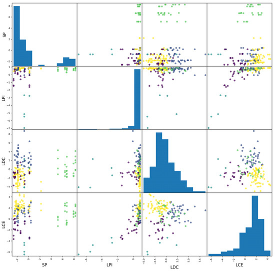 The scatterplot matrix of input features for cluster visualization under scheme 2.