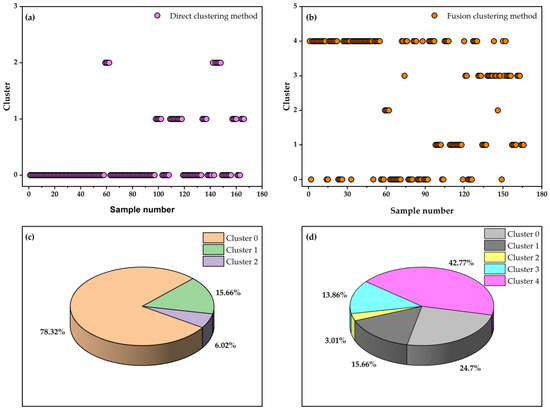 Cluster classifications of gas well samples and their corresponding proportions under the two clustering schemes: (a) cluster distribution based on the direct clustering method, (b) cluster distribution based on the fusion clustering method, (c) proportional distribution of clusters under the direct clustering method, and (d) proportional distribution of clusters under the fusion clustering method.