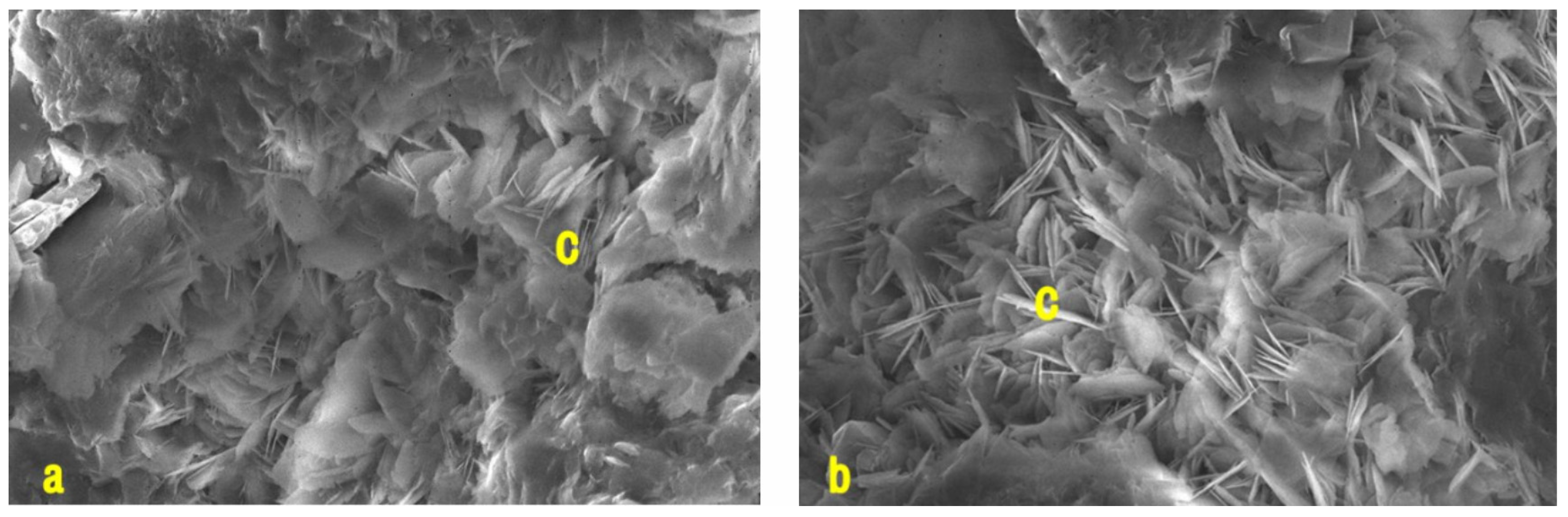 Photomicrograph of Chlorite in the ZLX Ahe Formation reservoir, Eastern Kuqa Depression. (a) SEM image of chlorite; (b) SEM image of chlorite. c: Chlorite.