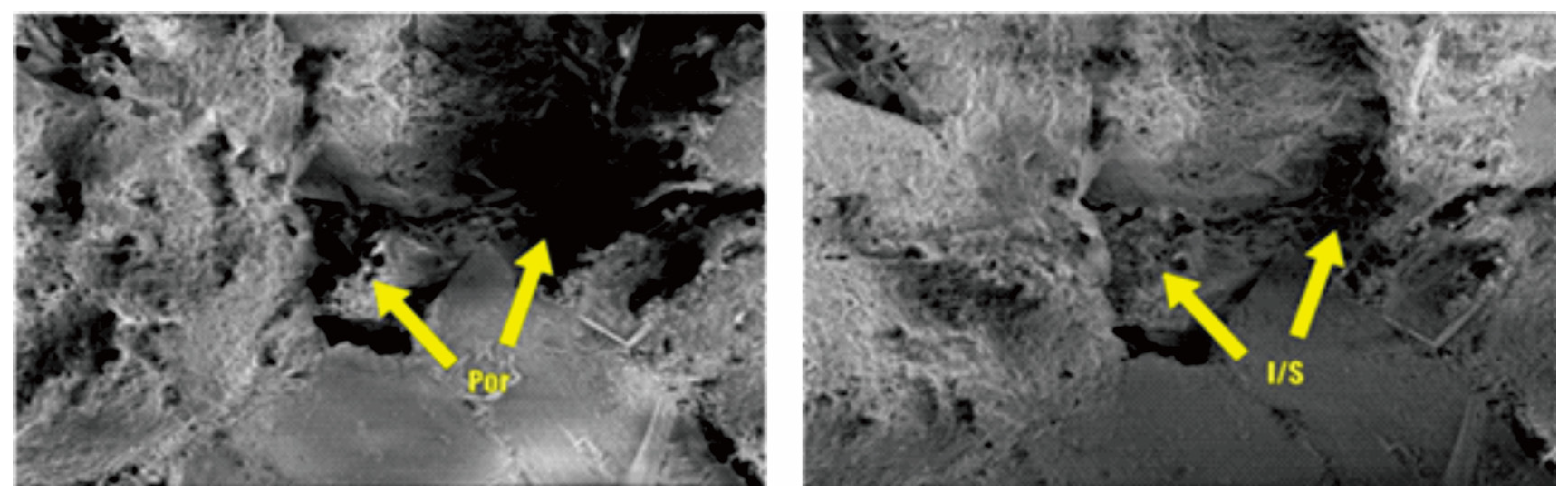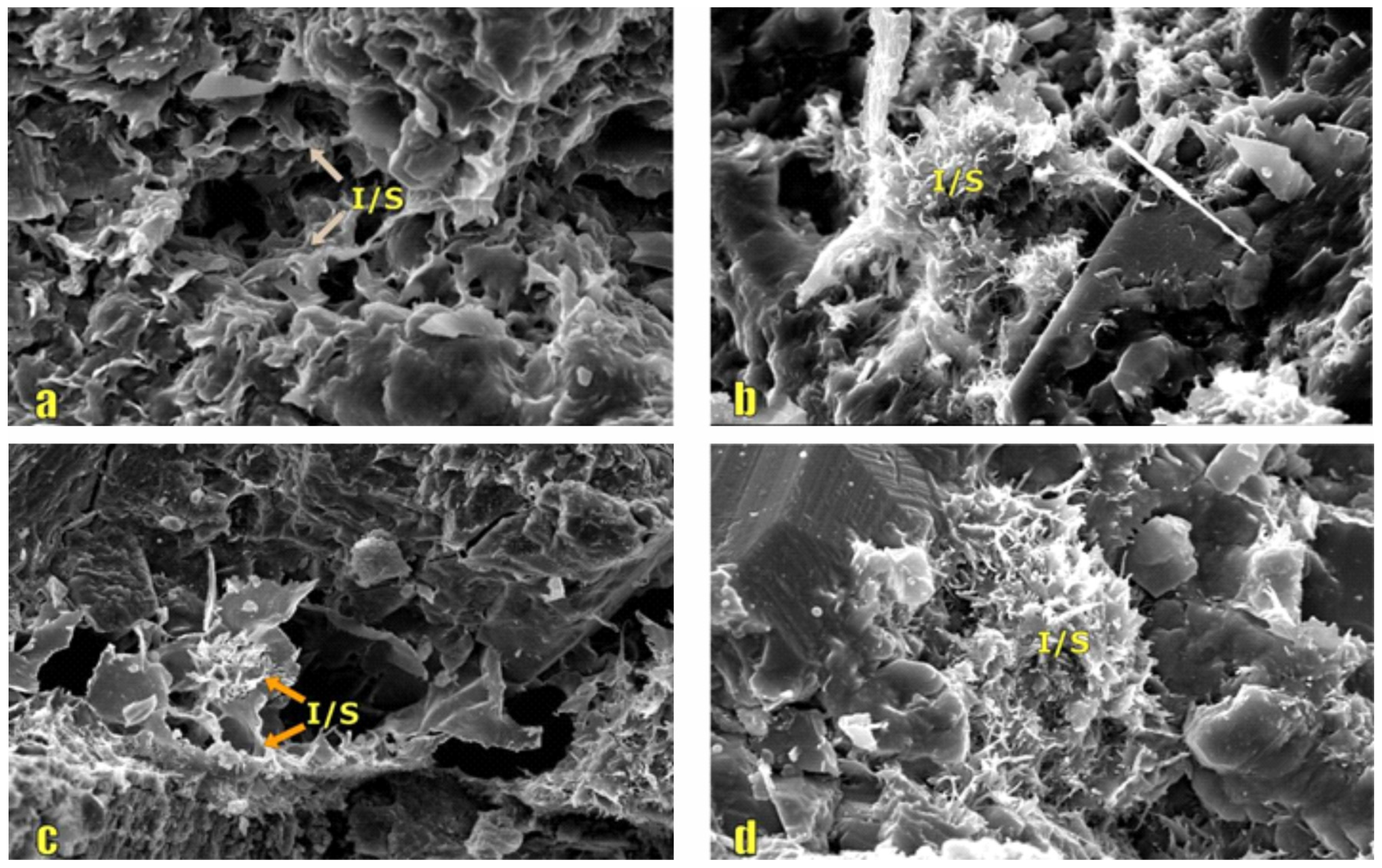 Photomicrograph of Illite/Smectite mixed layer in the ZLX Ahe Formation reservoir, Eastern Kuqa Depression. (a–d) SEM image of illite/smectite mixed layer. I/S: Illite/Smectite mixed layer.