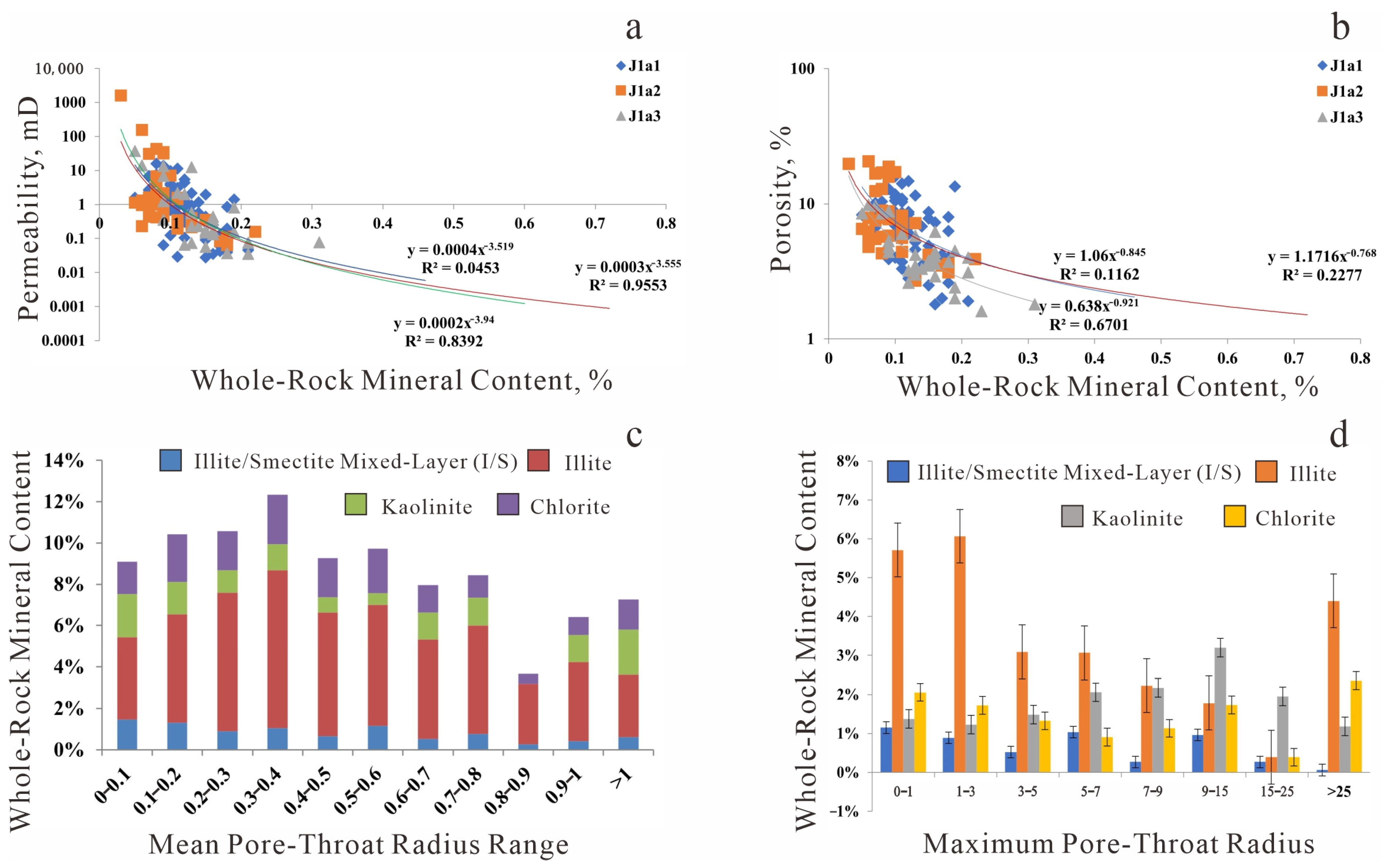 Relationship between clay minerals and reservoir properties. (a) Total clay content vs. Permeability; (b) Total clay content vs. Porosity; (c) Average pore-throat radius range vs. Total clay content; (d) Maximum pore-throat radius range vs. total clay content.