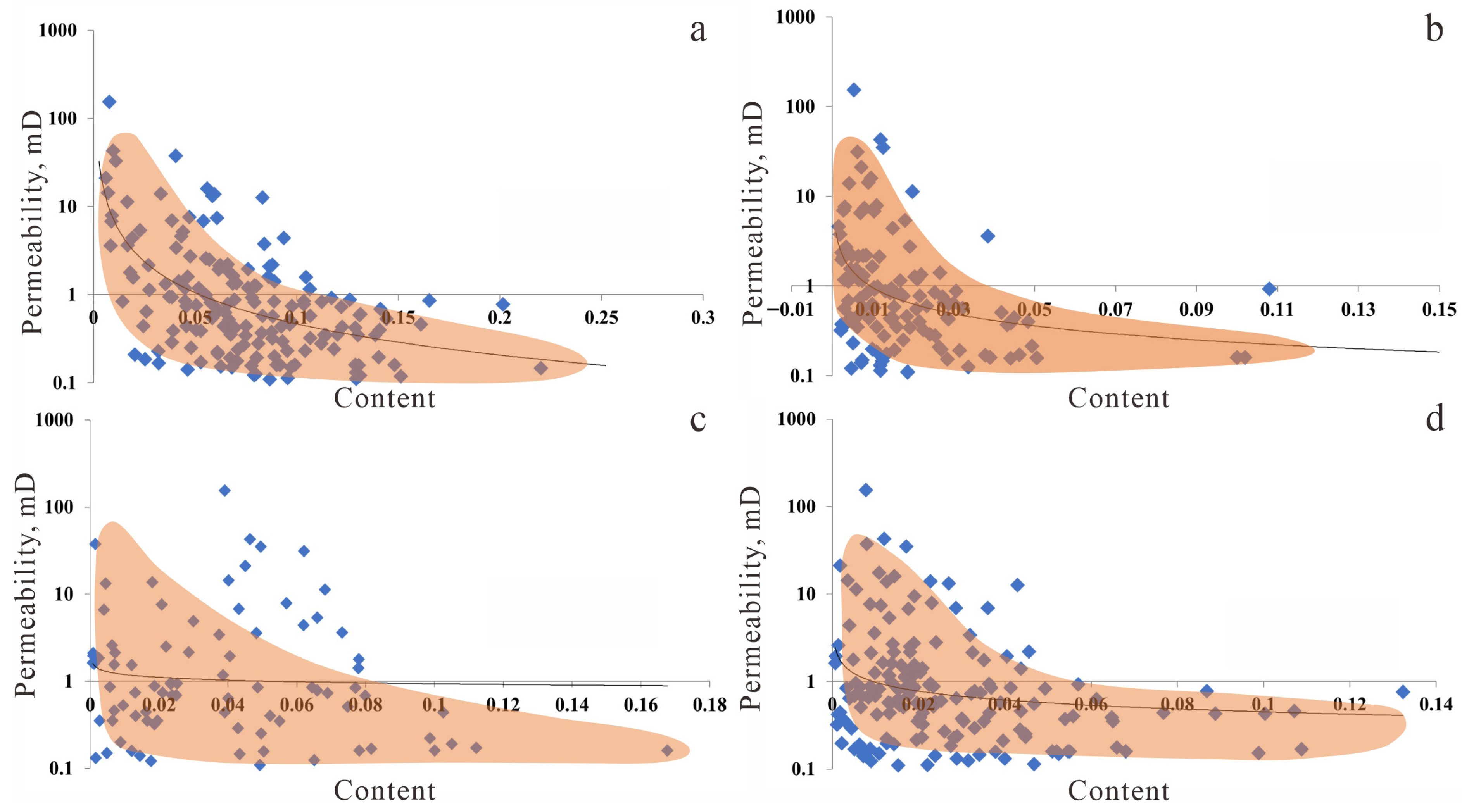 Relationship between mineral content and Permeability (the blue square in the graph represent permeability values at different contents, while the orange area indicates the trend of the data). (a) Illite vs. Permeability; (b) Illite/Smectite mixed layer vs. Permeability; (c) Kaolinite vs. Permeability; (d) Chlorite vs. Permeability.