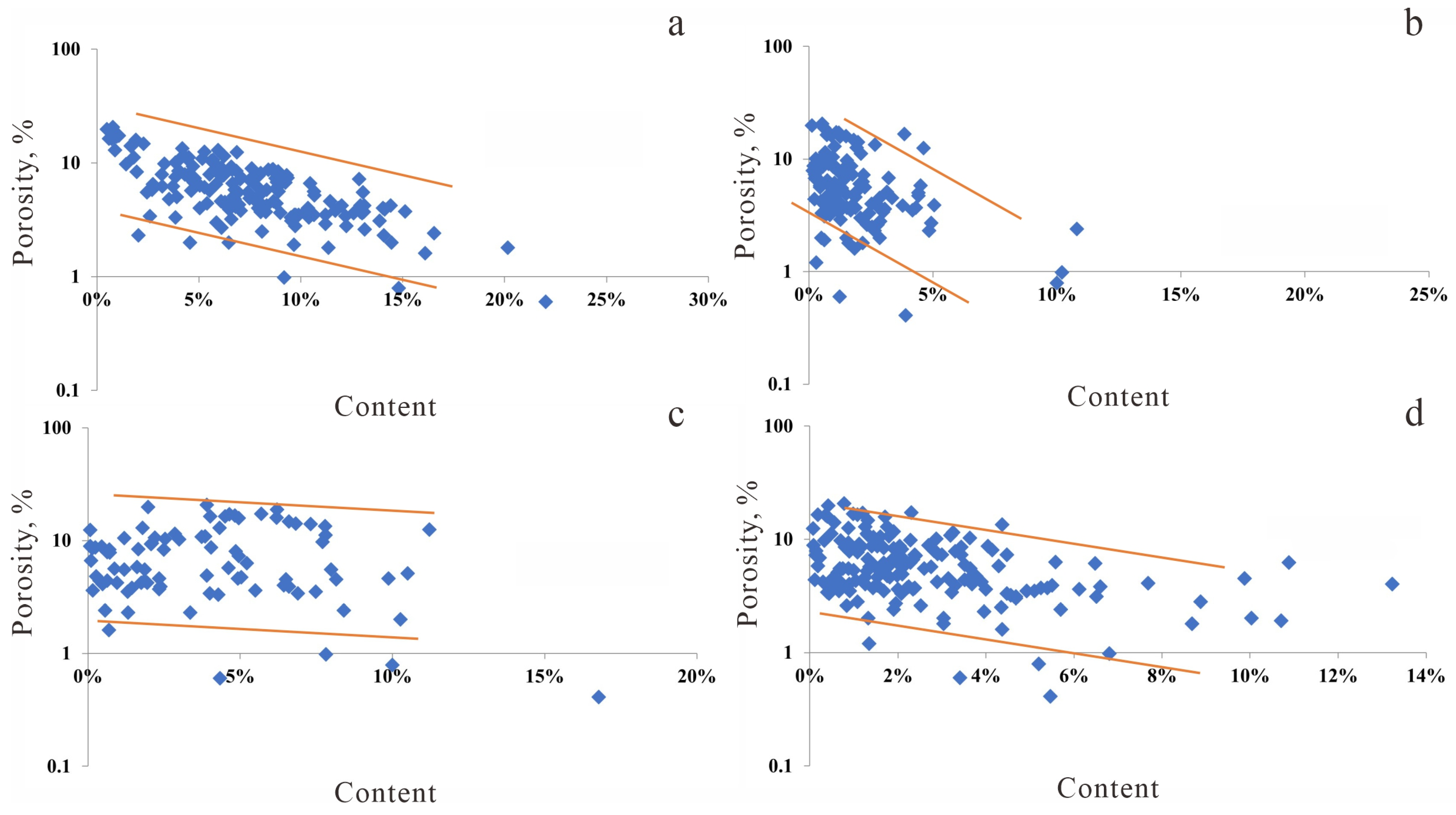 Relationship between mineral content and Porosity (the blue square in the graph represent porosity values at different contents, while the orange area indicates the trend of the data). (a) Illite vs. Porosity; (b) Illite/Smectite mixed layer vs. Porosity; (c) Kaolinite vs. Porosity; (d) Chlorite vs. Porosity.