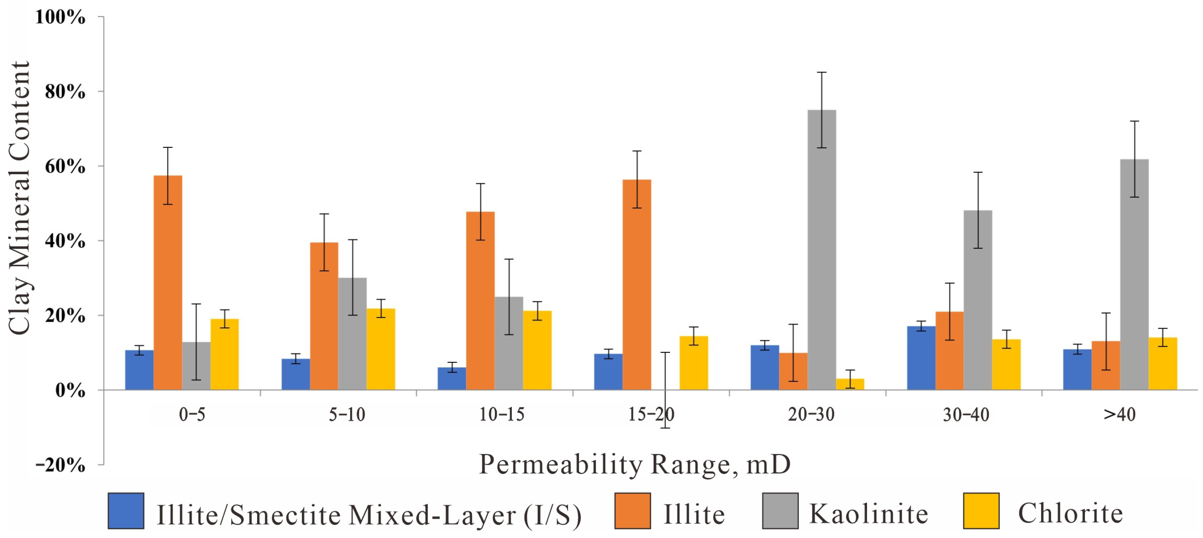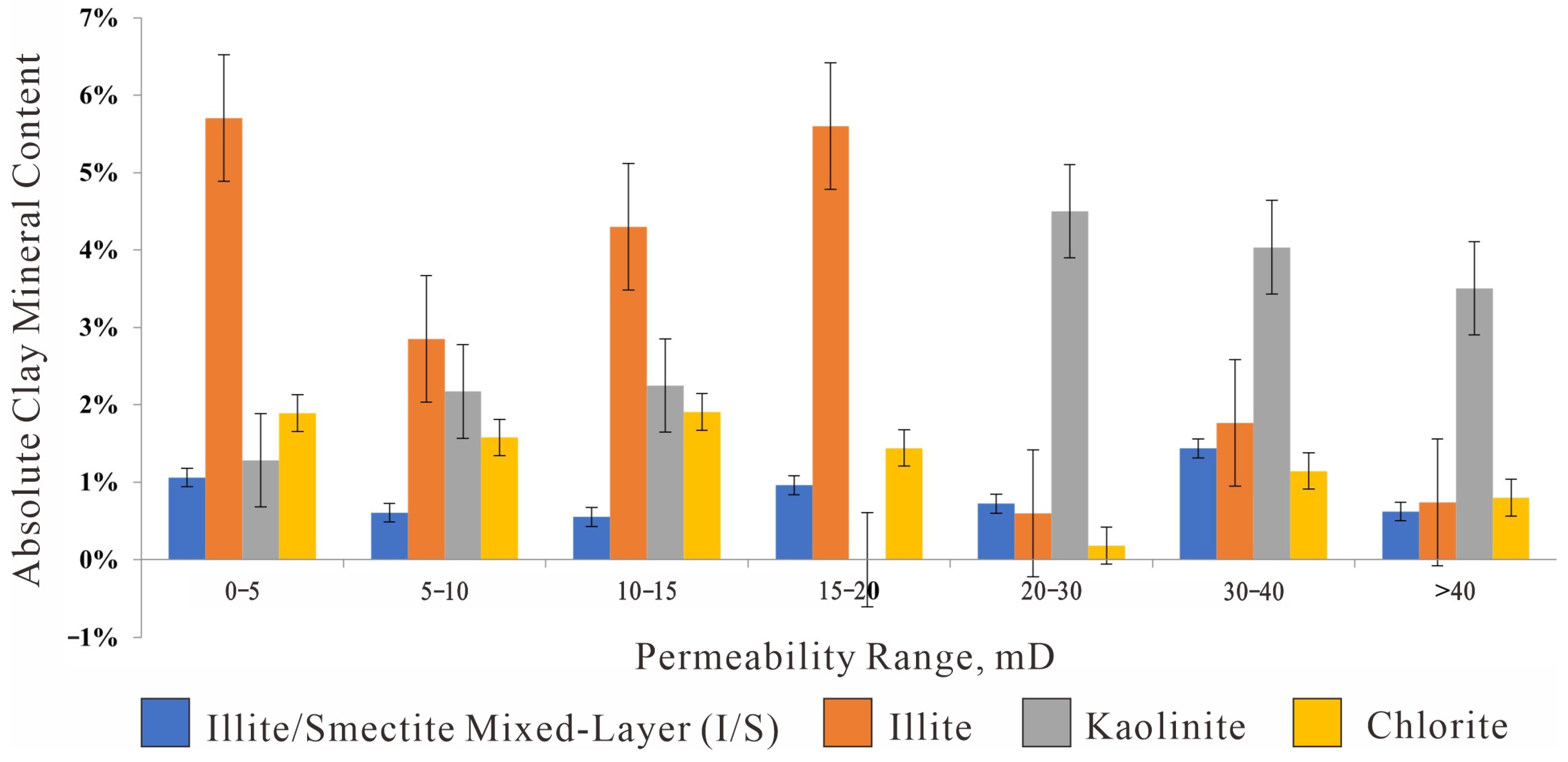 Absolute content of clay minerals in different Permeability ranges (Bar Chart).