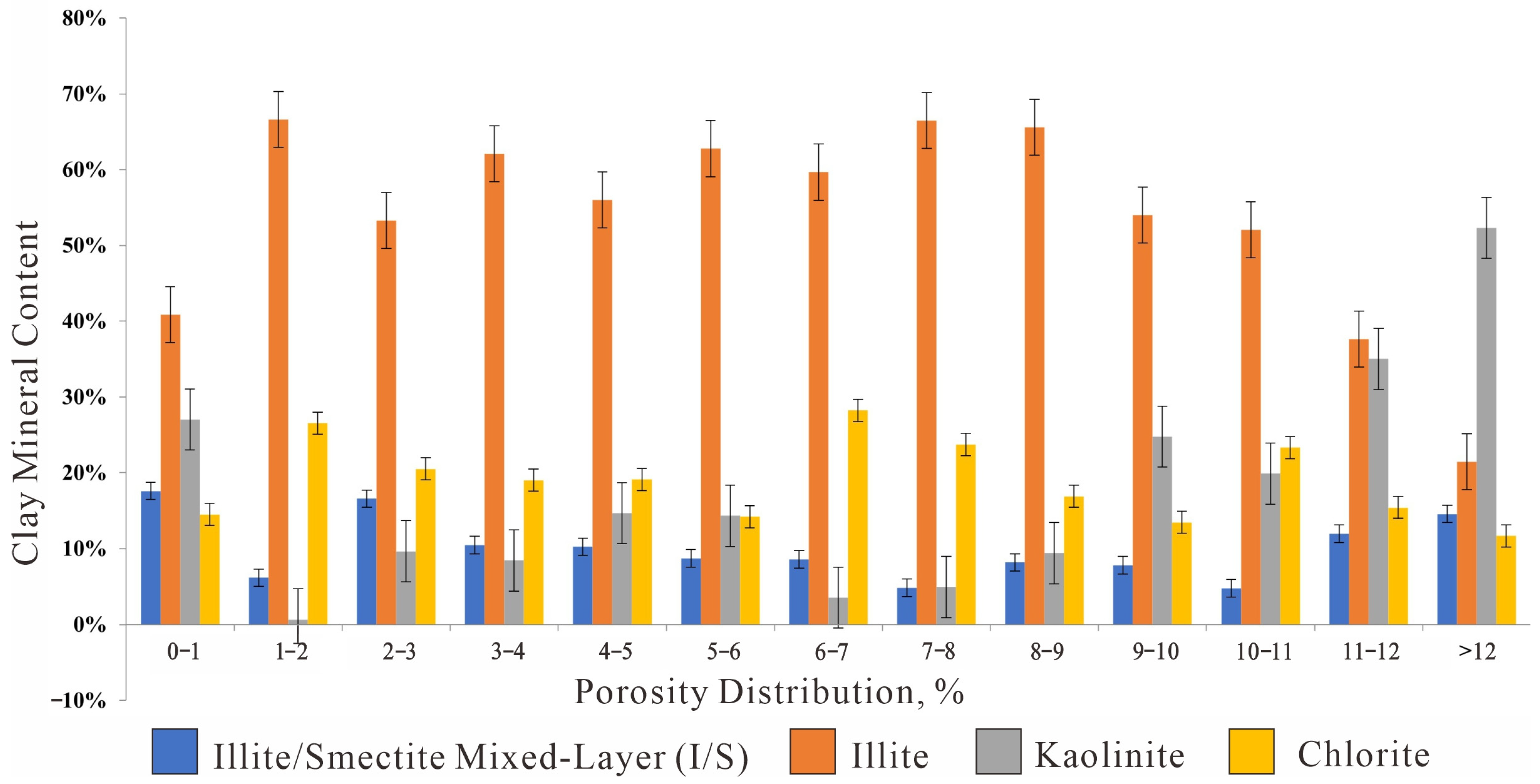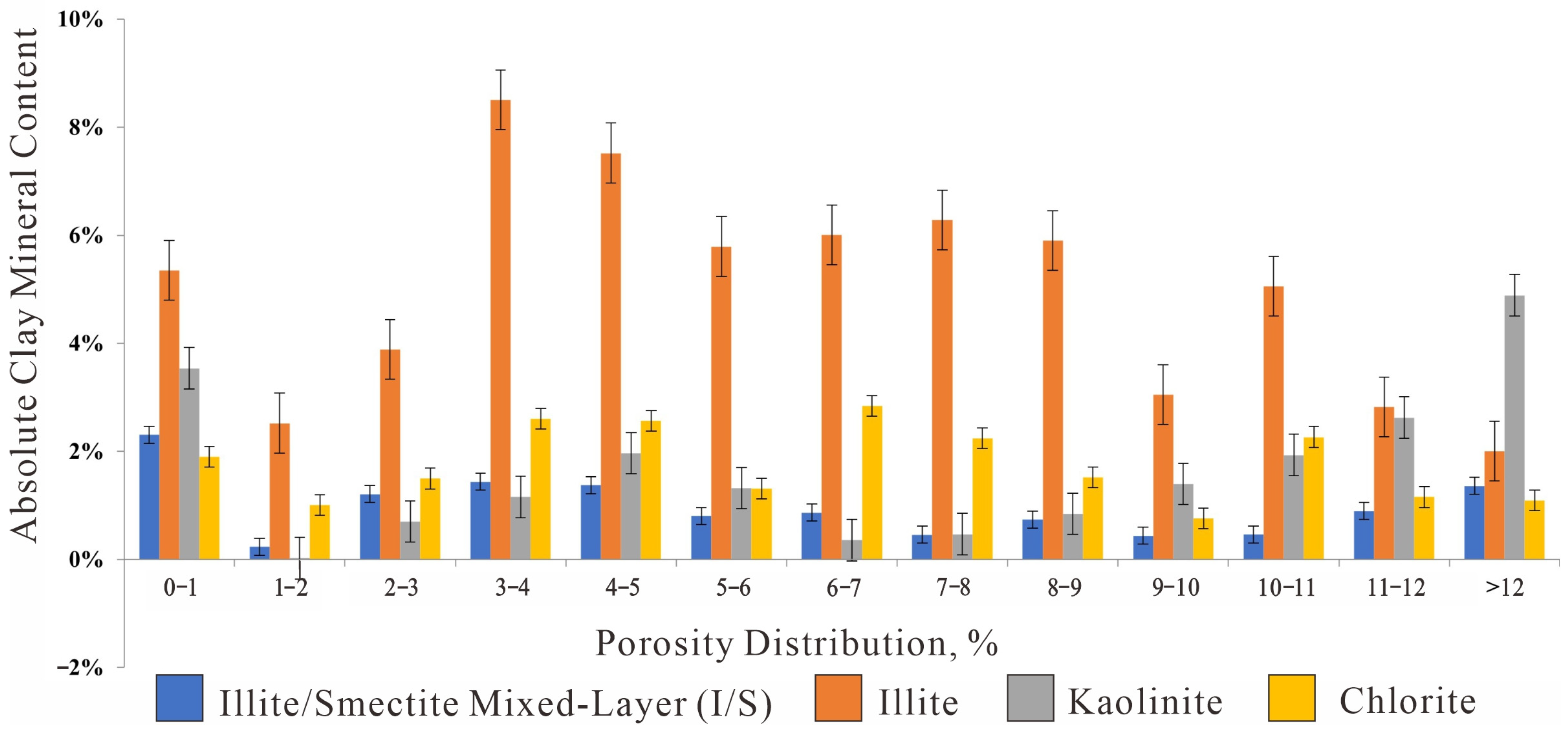 Absolute content of clay minerals in different Porosity ranges (Bar Chart).