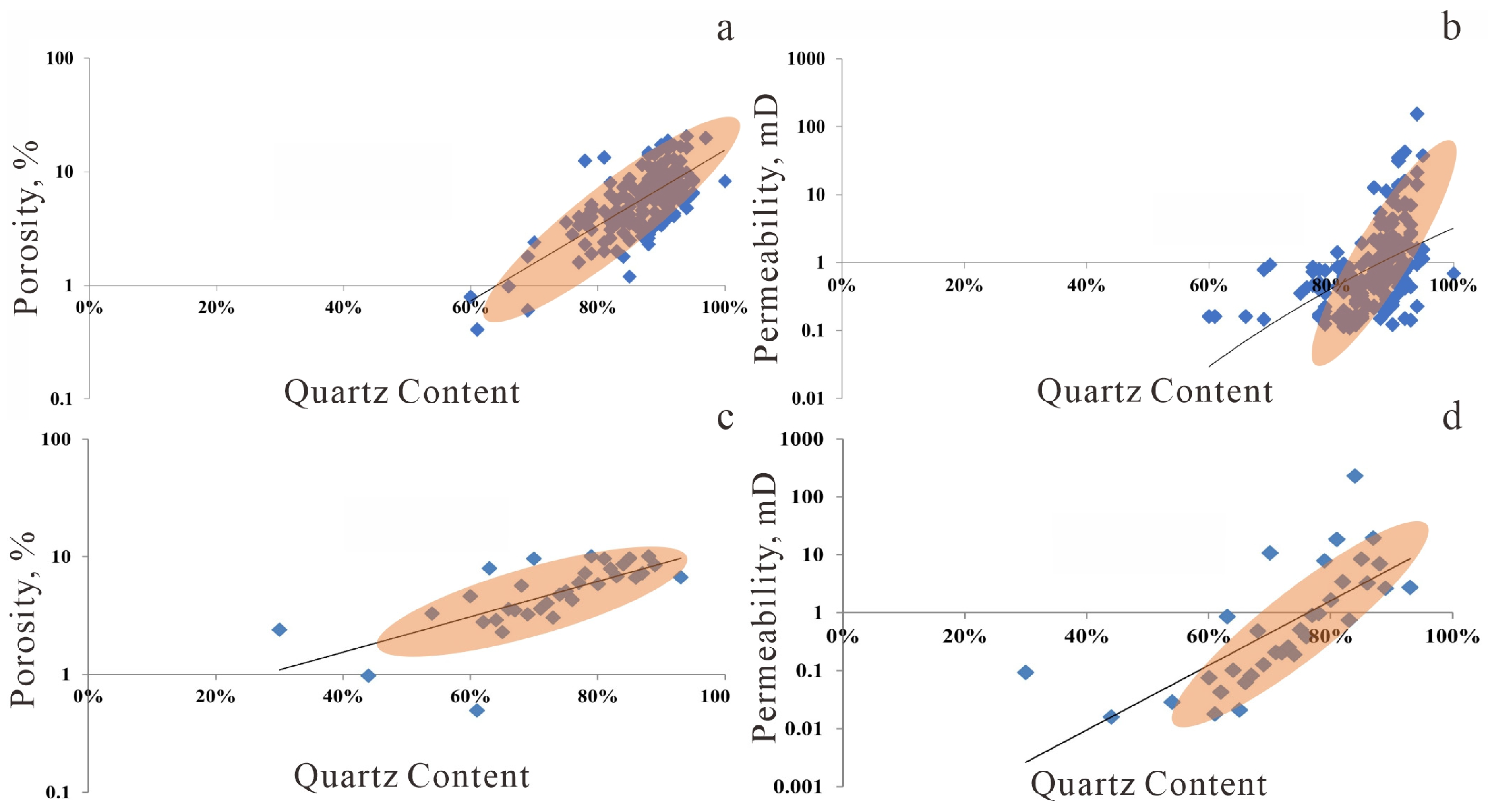 Relationship between rock grain content and reservoir properties (the blue square in the graph represent porosity values at different Quartz contents, while the orange area indicates the trend of the data). (a) Effect of Quartz and feldspar content on Porosity; (b) Effect of Quartz and feldspar content on Permeability; (c) Effect of Quartz content on Porosity; (d) Effect of Quartz content on Permeability.