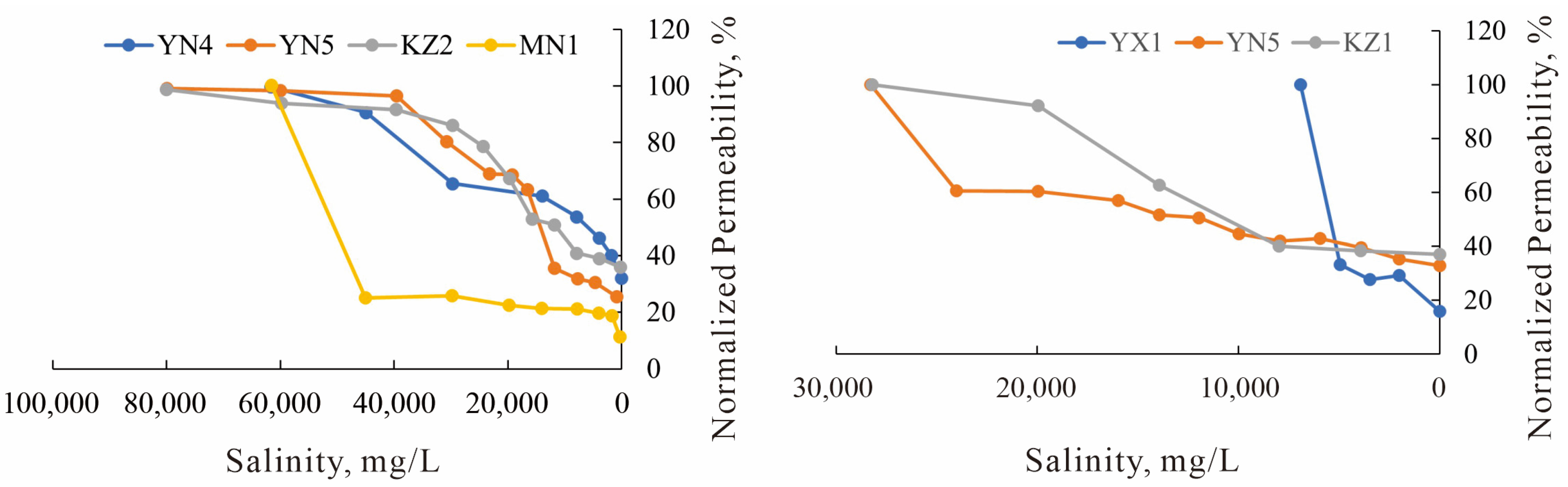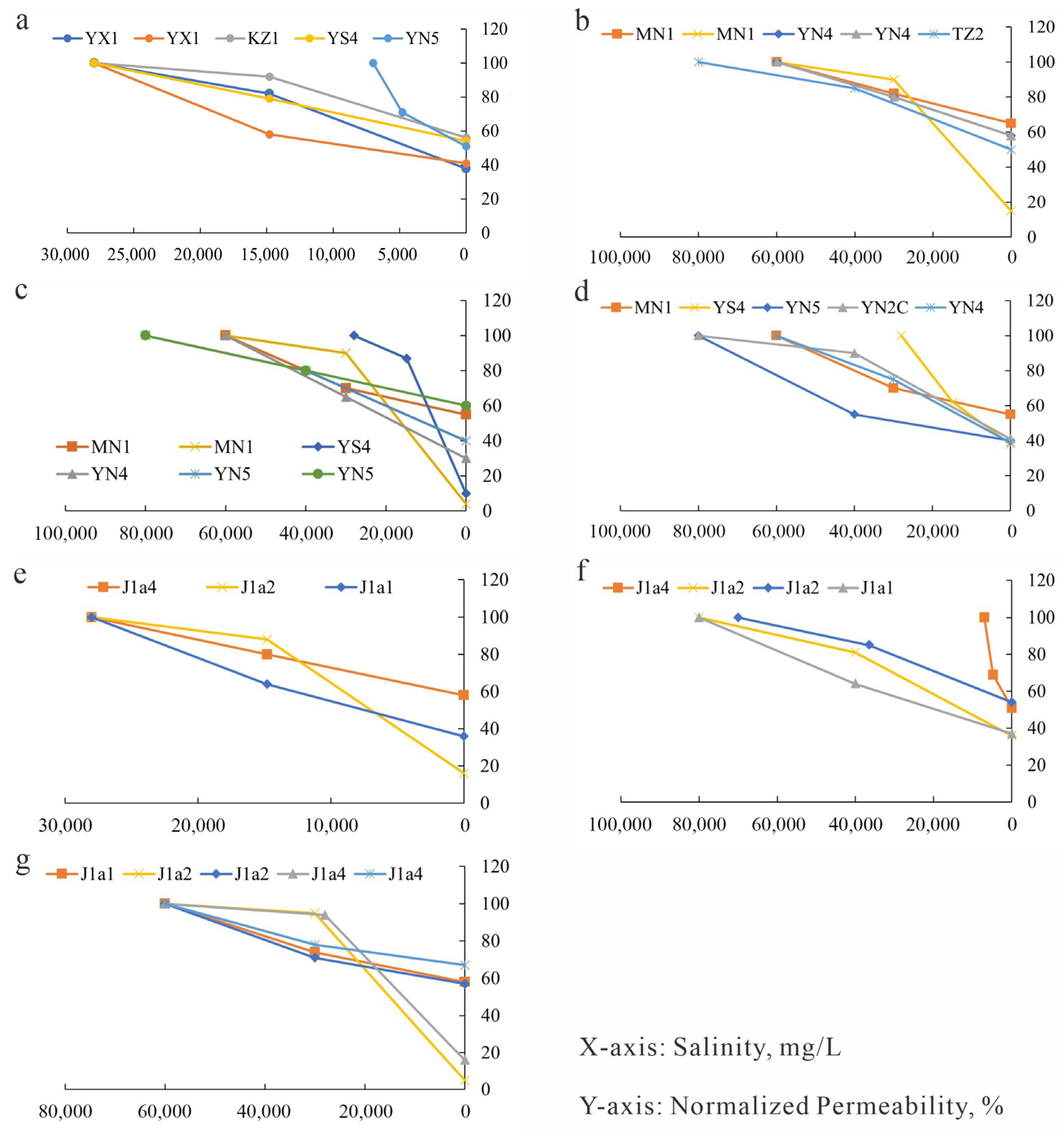 Water sensitivity experimental curves. (a) J1a4 layer, Eastern Kuqa Depression; (b) J1a4 layer, Eastern Kuqa Depression; (c) J1a2 layer, Eastern Kuqa Depression; (d) J1a1 layer, Eastern Kuqa Depression; (e) Well Yishen-4, Northeastern Kuqa Depression; (f) Well Yinan-5, Eastern Kuqa Depression; (g) Well Mingnan-1, Eastern Kuqa Depression.