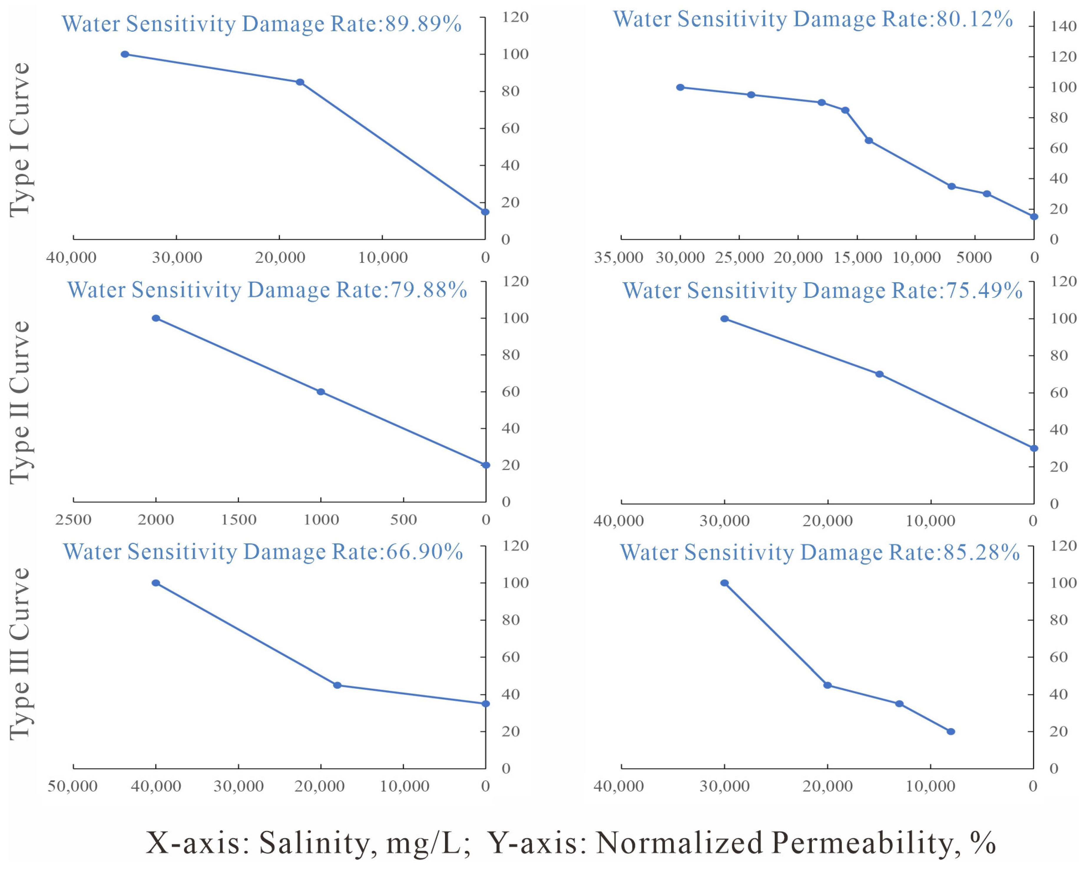 Experimental results of water sensitivity damage for reservoirs in the Eastern Kuqa Depression.