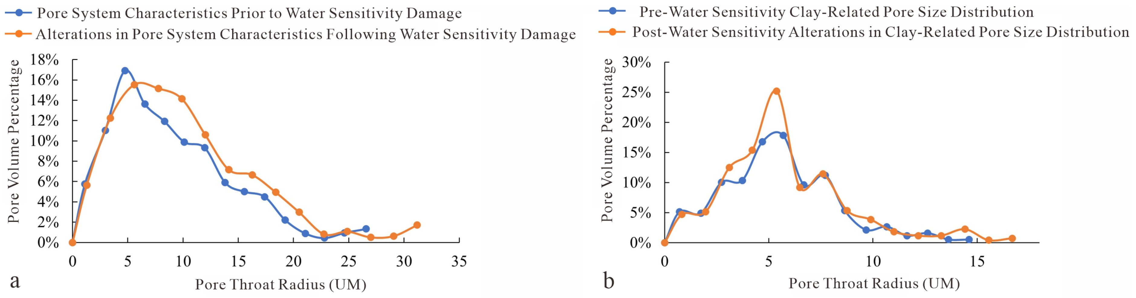 Relationship between pore radius and pore volume before and after water sensitivity damage. (a) Dissolution intergranular pores; (b) Micropores.
