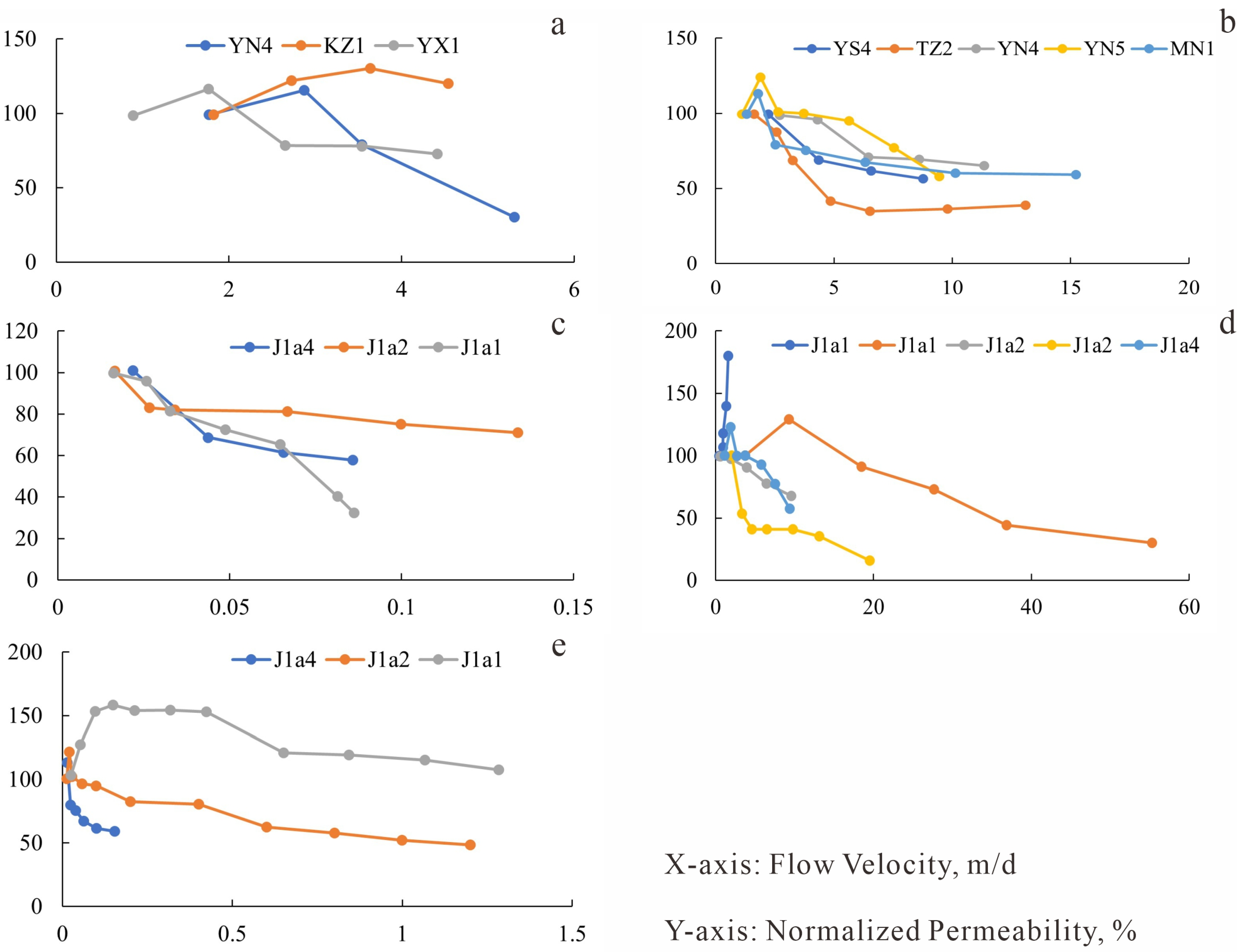 Velocity sensitivity experimental curves (Partial core samples exhibited increased flow velocity due to fluid-induced damage to sandstone grains). (a) J1a4 layer, Eastern Kuqa Depression; (b) J1a4 layer, Eastern Kuqa Depression; (c) Well YS4, Eastern Kuqa Depression; (d) Well YN5, Eastern Kuqa Depression; (e) Well MN1, Eastern Kuqa Depression.