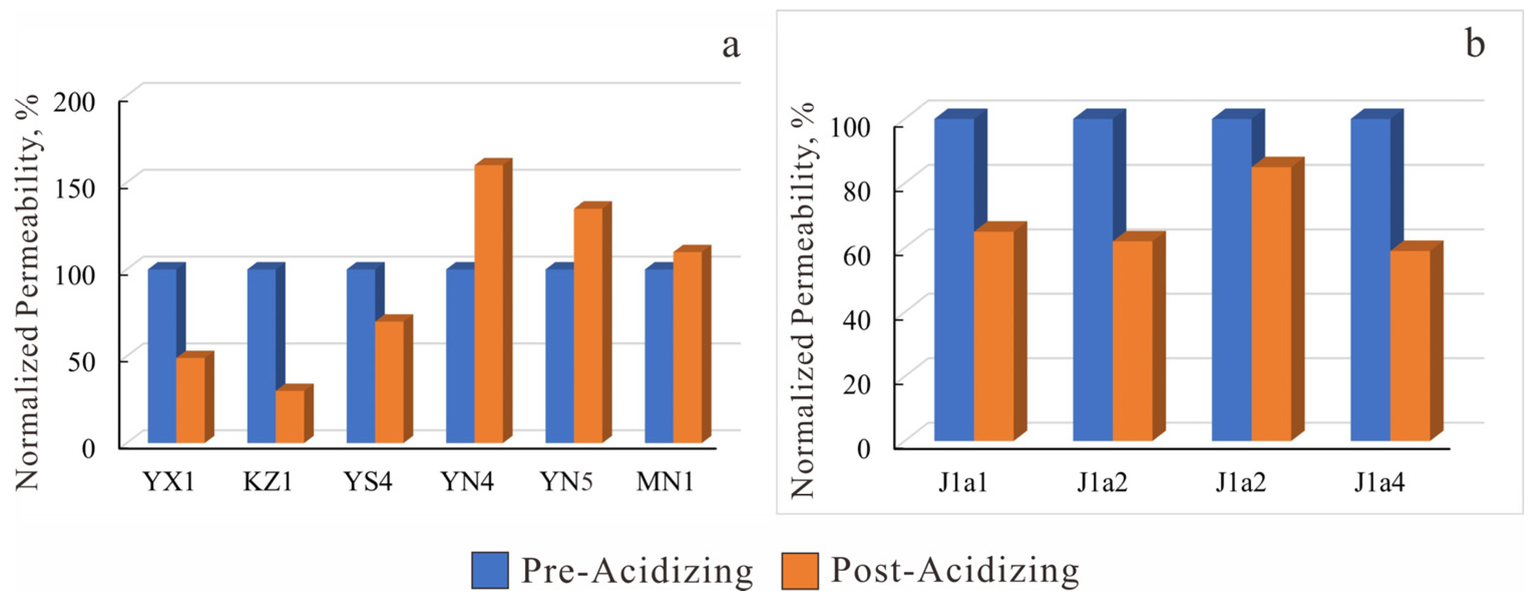 Acid sensitivity experimental histogram. (a) J1a4 layer in the study area; (b) Well YN5 in the study area.