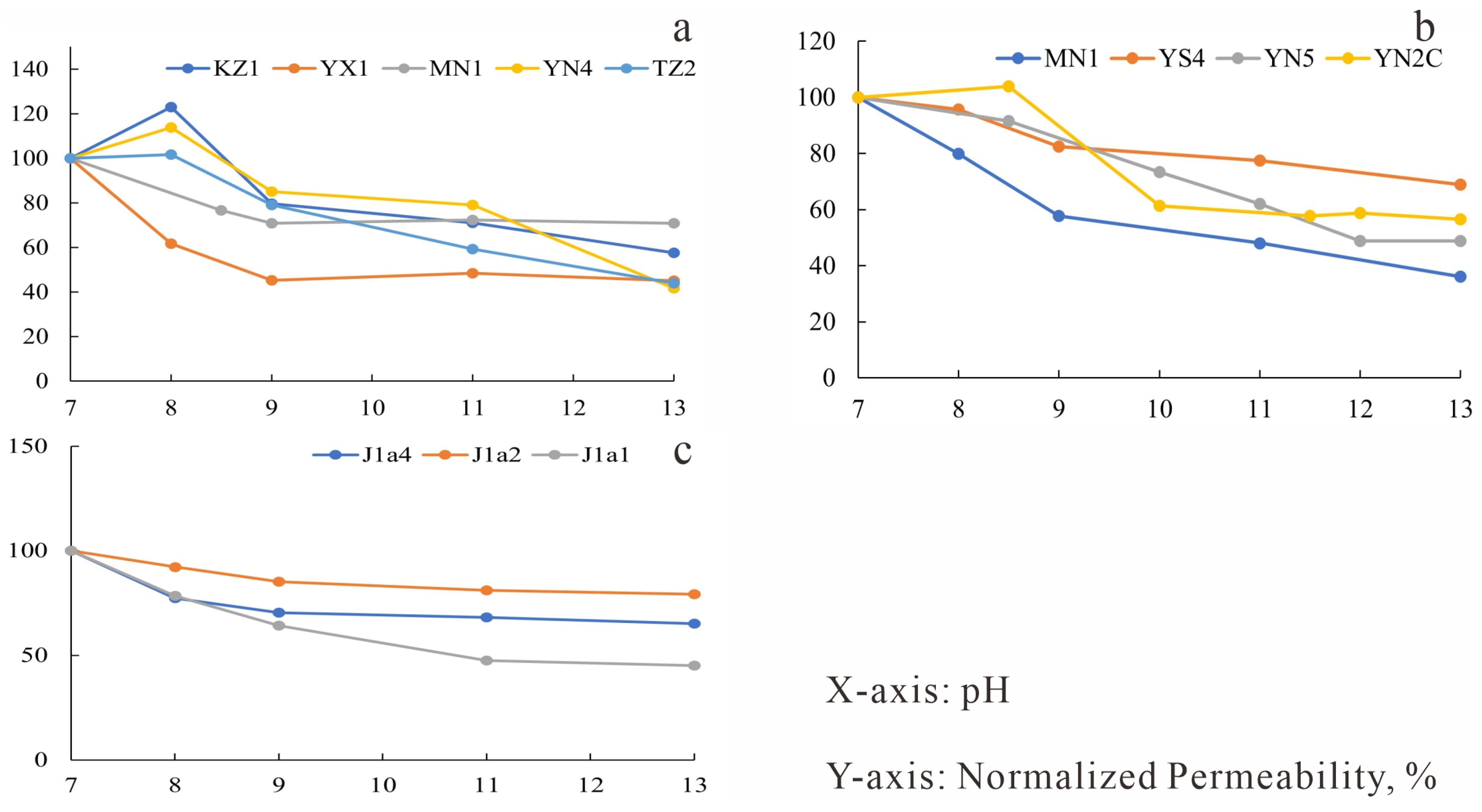 Alkali sensitivity experimental curves. (a) J1a4 layer in the study area; (b) J1a1 layer in the study area; (c) Well MN1 in the study area.