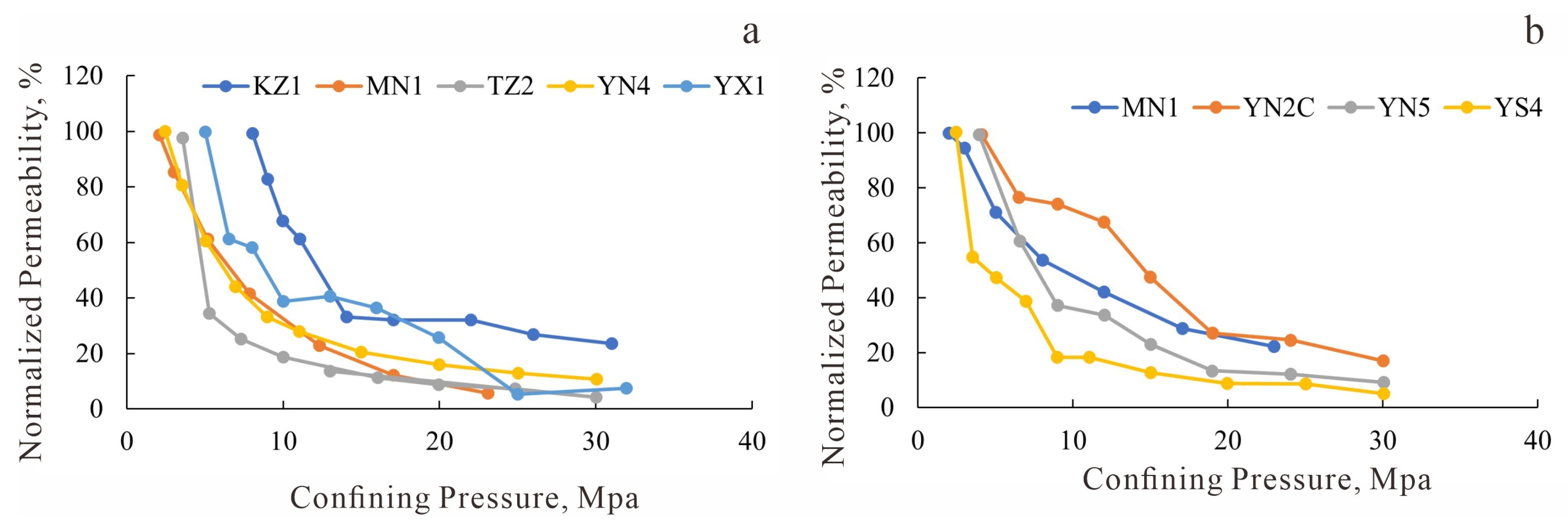 Experimental curves of maximum damage rate for stress sensitivity. (a) J1a4 layer in the study area; (b) J1a1 layer in the study area.