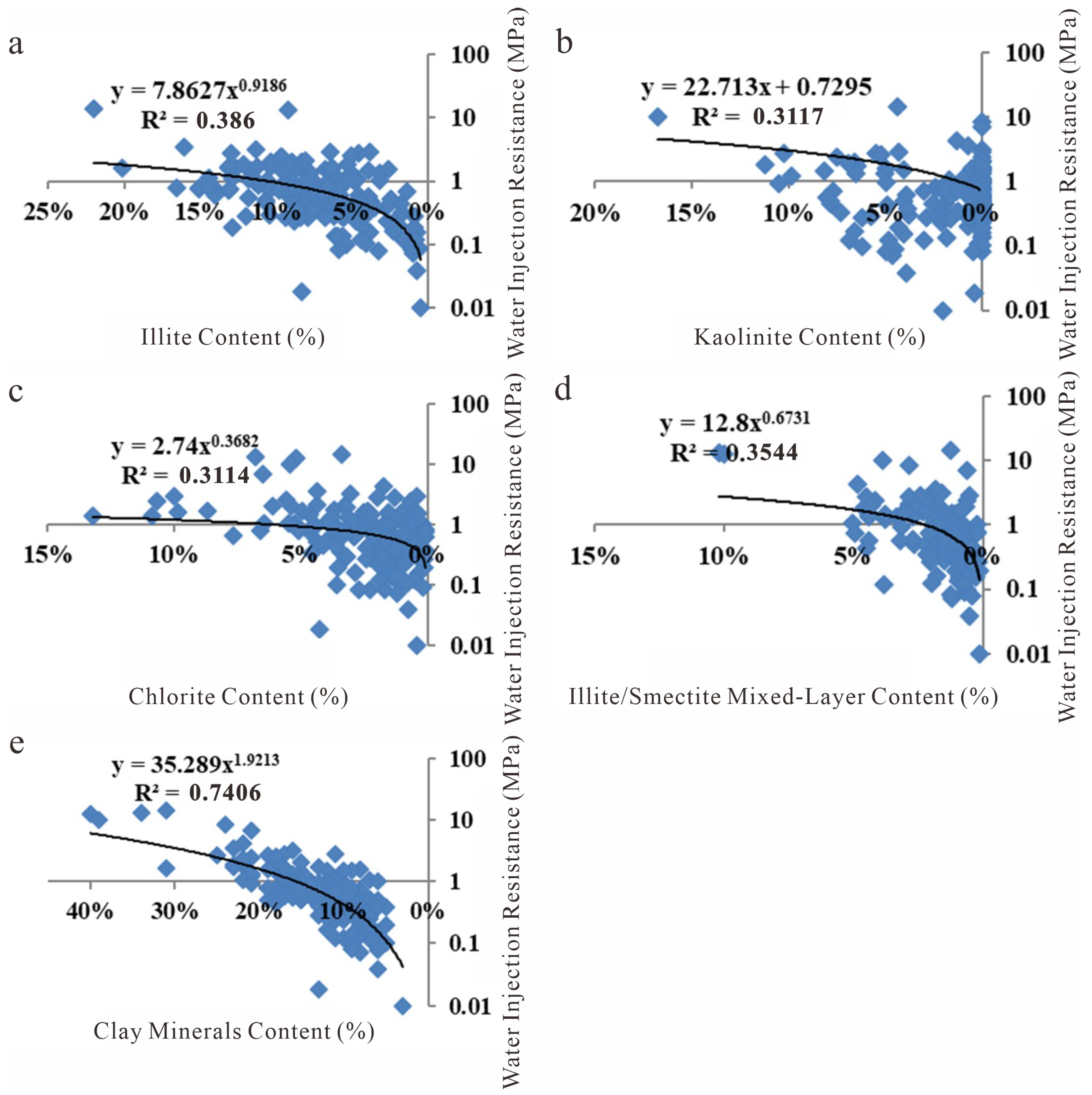 Relationship between total clay content and water injection resistance (the blue square represent water injection resistance values at different mineral contents, and the black line indicates the trend line.). (a) Relationship between Illite content and water injection resistance; (b) Relationship between Kaolinite content and water injection resistance; (c) Relationship between Chlorite content and water injection resistance; (d) Relationship between Illite/Smectite mixed-layer content and water injection resistance; (e) Relationship between Clay Mineral content and water injection resistance.