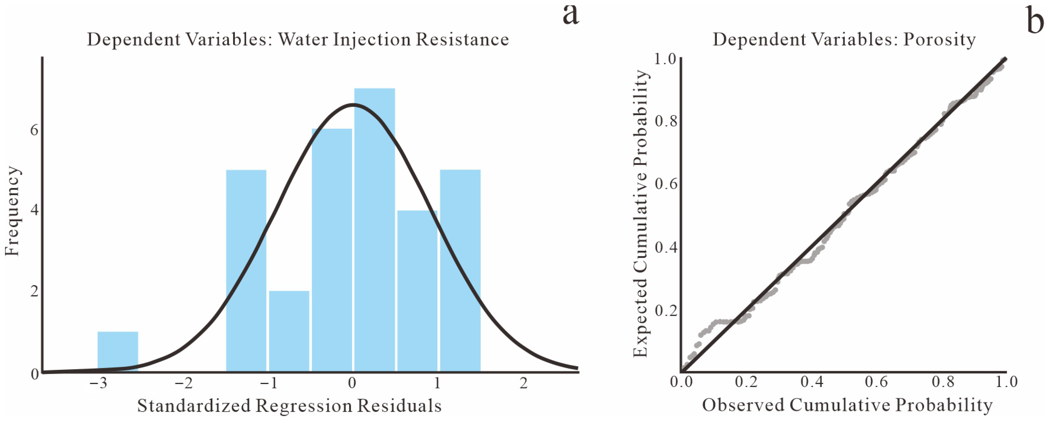Distribution characteristics of standardized regression residuals. (a) Histogram; (b) Normal P-P plot.